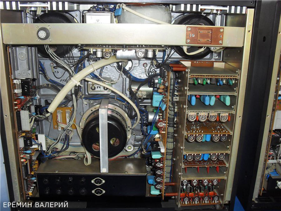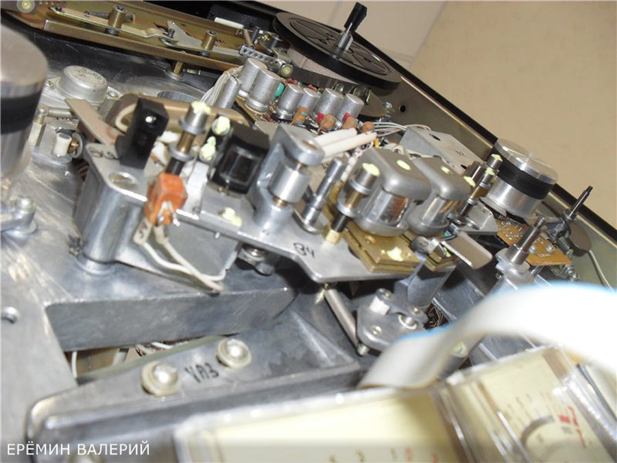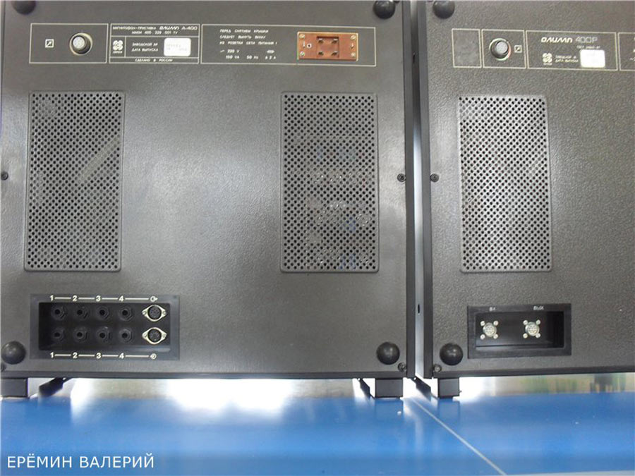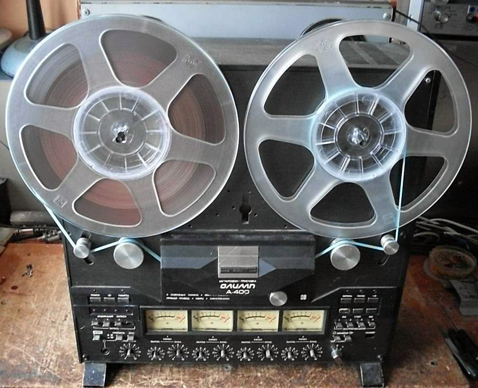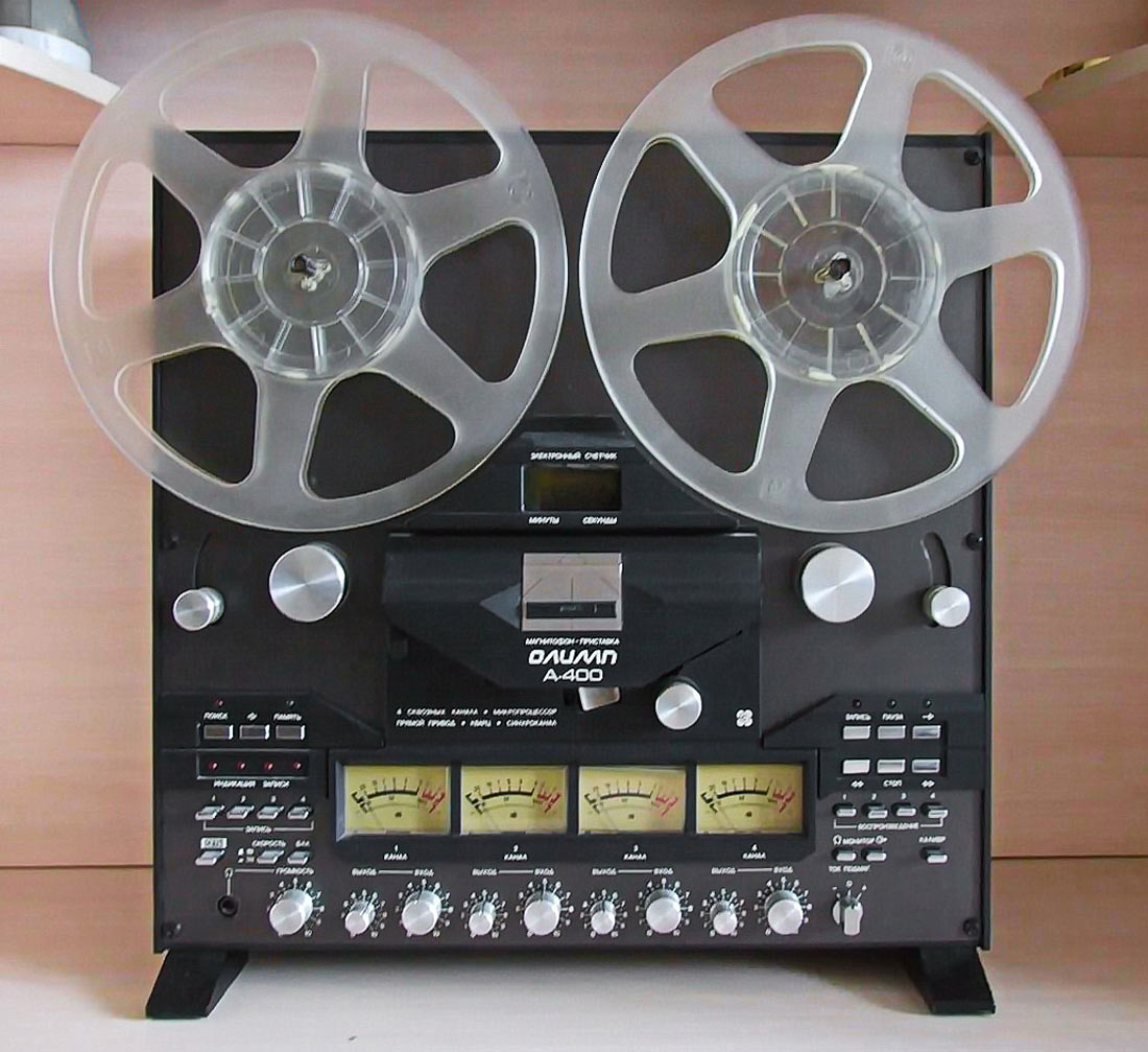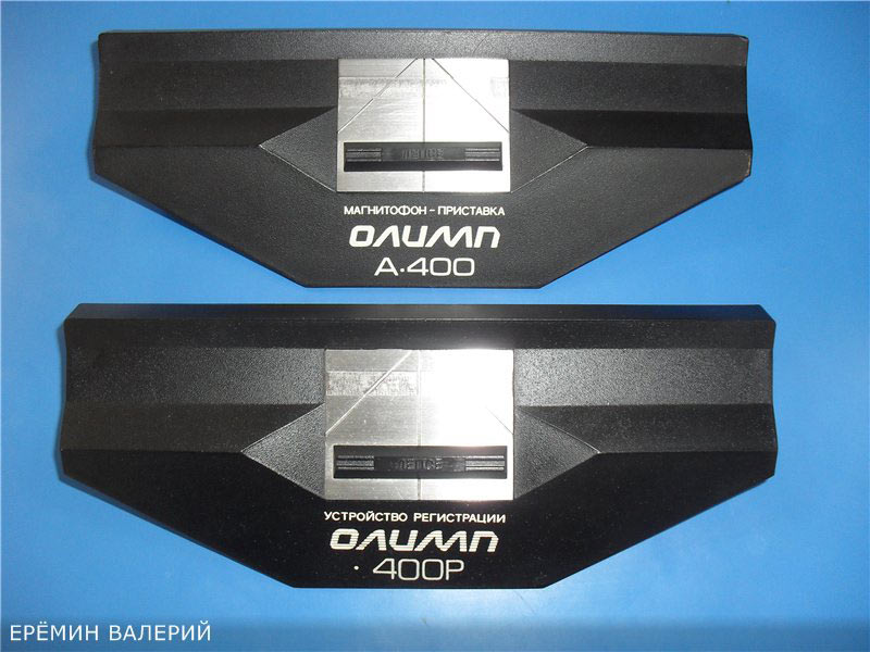 Катушечный магнитофон-приставка *Олимп А-400* с 1994 года выпускало Кировское электромашиностроительное ПО им. Лепсе. Профессиональный 4-х канальный МП предназначен для высококачественной записи фонограмм в радио и телестудиях, театрах, домах культуры, в студиях звукозаписи. С его помощью можно вести запись информации в научно-исследовательских заведениях. МП позволяет вести запись по четырём каналам на стандартной магнитной ленте шириной 6,3 мм. МП имеет электронное управление режимами работы, прямой привод, кварцевую стабилизацию скорости движения ленты, индикацию режимов работы, уровней записи и воспроизведения по каждому каналу, режим редактирования, возможность подключения системы беспроводного дистанционного управления, электронный счётчик расхода ленты, автостоп и др. Скорость движения магнитной ленты 38,1 см/с; среднее отклонение от номинальной скорости ±0,5%; взвешенное значение детонации не более ± 0,06%; эффективный диапазон рабочих частот - 31,5...22.000 Гц; полное взвешенное отношение сигнал/шум не хуже 62 дБ; уровень стирания записи не хуже 70 дБ; коэффициент третьей гармоники на частоте 1000 Гц - 1,2%; мощность, потребляемая от сети не более 120 Вт габариты аппарата 470x480x220 мм; масса 28 кг. На базе модели выпускали и устройство регистрации **Олимп-400Р**, отличающееся 2-мя скоростями и некоторыми изменениями в конструкции и схеме, их можно посмотреть с 4-й фотографии.