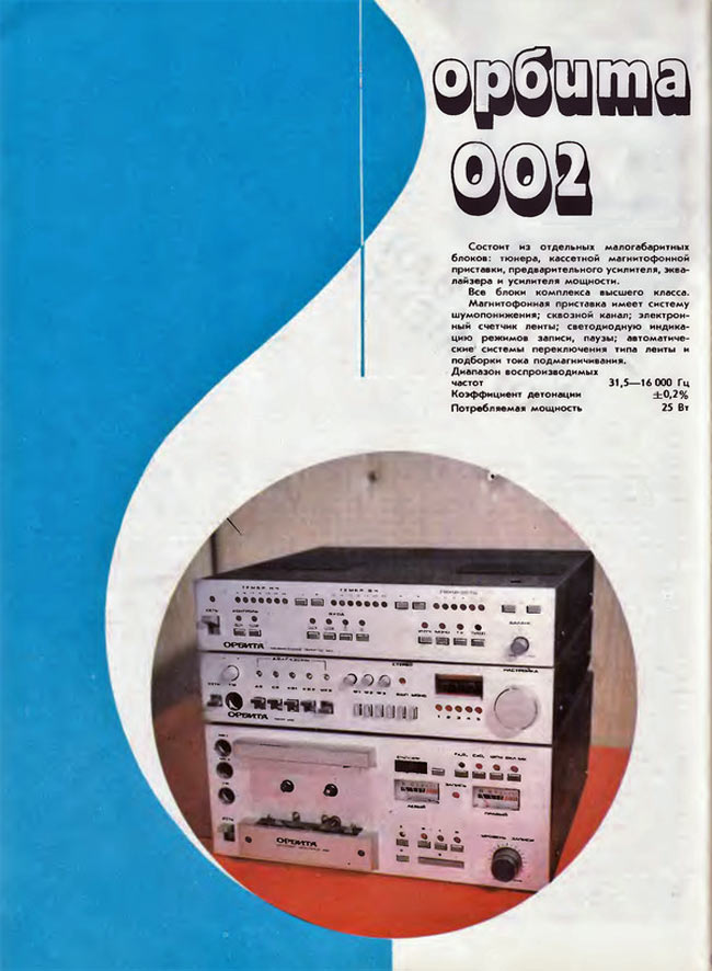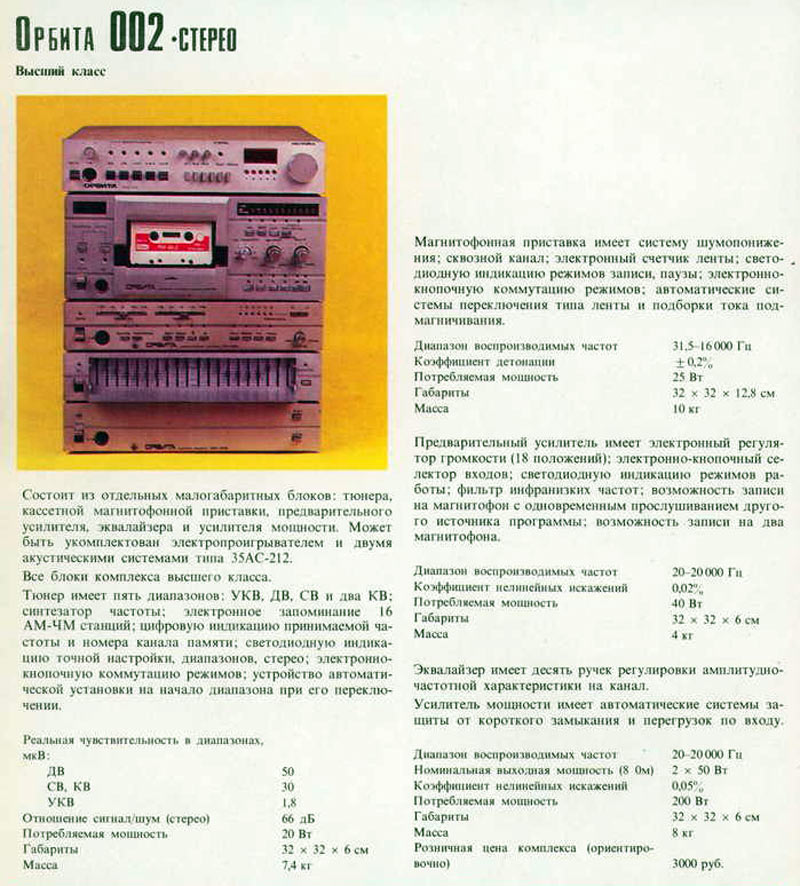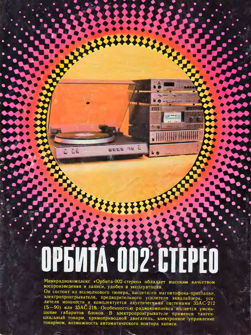 Малогабаритный блочный музыкальный комплекс *Орбита-002-стерео* с 1985 года выпускал Ростовский завод *Электроаппарат*. МК состоит из 4-х автономных устройств. Это эквалайзер **Орбита ЭК-002-стерео**, кассетный МП **Орбита МП-121-стерео**, УМ **Орбита УМ-002-стерео** и УП **Орбита УП-002-стерео**. Все эти устройства имеют свои блоки питания и могли продаваться как отдельно, так и в составе музыкального центра. Все входящие в МК аппараты описаны на сайте.