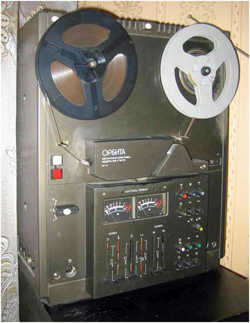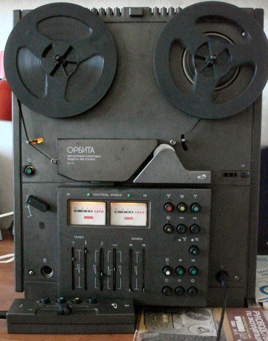 Катушечный магнитофон-приставка *Орбита-106-стерео* с 1984 года выпускался Ленинградским заводом *Пирометр*. **Орбита-106-стерео** - настольный катушечный магнитофон-приставка 1-й группы сложности, предназначенный для записи фонограмм на магнитную ленту с микрофона, радиоприёмника, радиолинии, телевизора и воспроизведения сделанной записи через выносные АС, или УКУ с АС. Скорость движения ленты 19,05 и 9,53 см/сек. Время записи на одной дорожке ленты толщиной 34 мкм при скорости 19,05 см/с - 96 минут, 9,53 см/с - 192 минуты. Время перемотки 150 секунд. Относительный уровень шумов в канале З/В при скорости 19,05 см/с - 58 дБ, 9,53 см/с - 52 дБ. Коэффициент гармоник при скорости 19,05 см/с - 2,5 %, 9,53 см/с около 2 %. Коэффициент детонации при скорости 19,05 см/с - 0,1 %, 9,53 см/с - 0,25 %. Полоса частот на скорости 19,05 см/с 31,5...20000 Гц, 9,53 см/с 31,5...14000 Гц. Частота тока подмагничивания 85 кГц. Номинальная выходная мощность 5 Вт, максимальная 15 Вт. Потребляемая мощность 150 Вт. Масса МП - 24 кг.