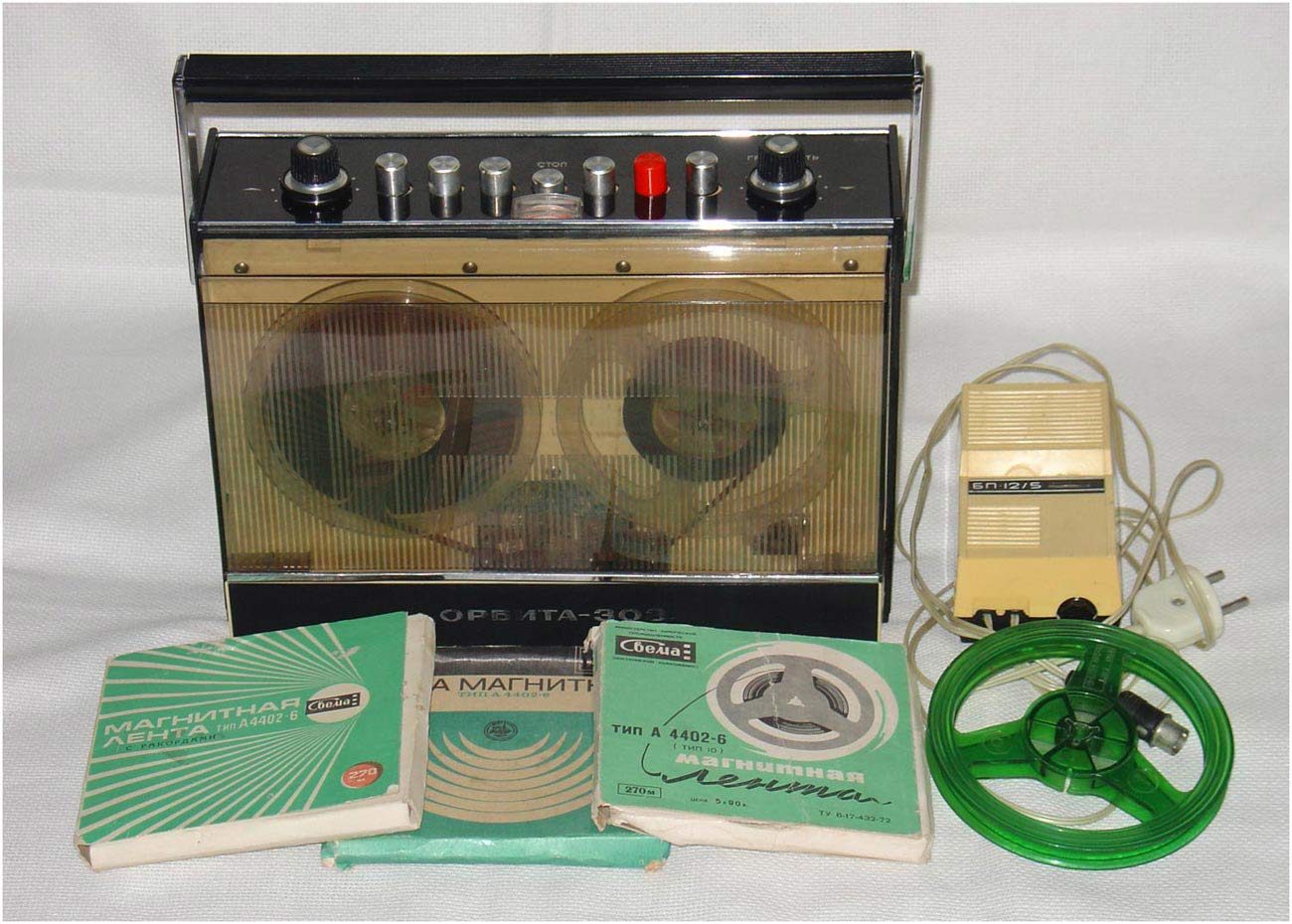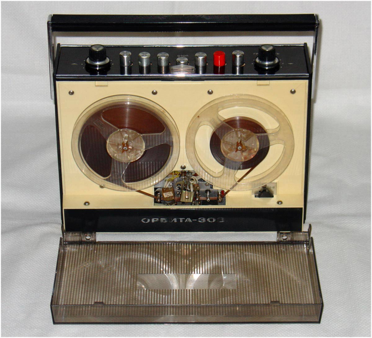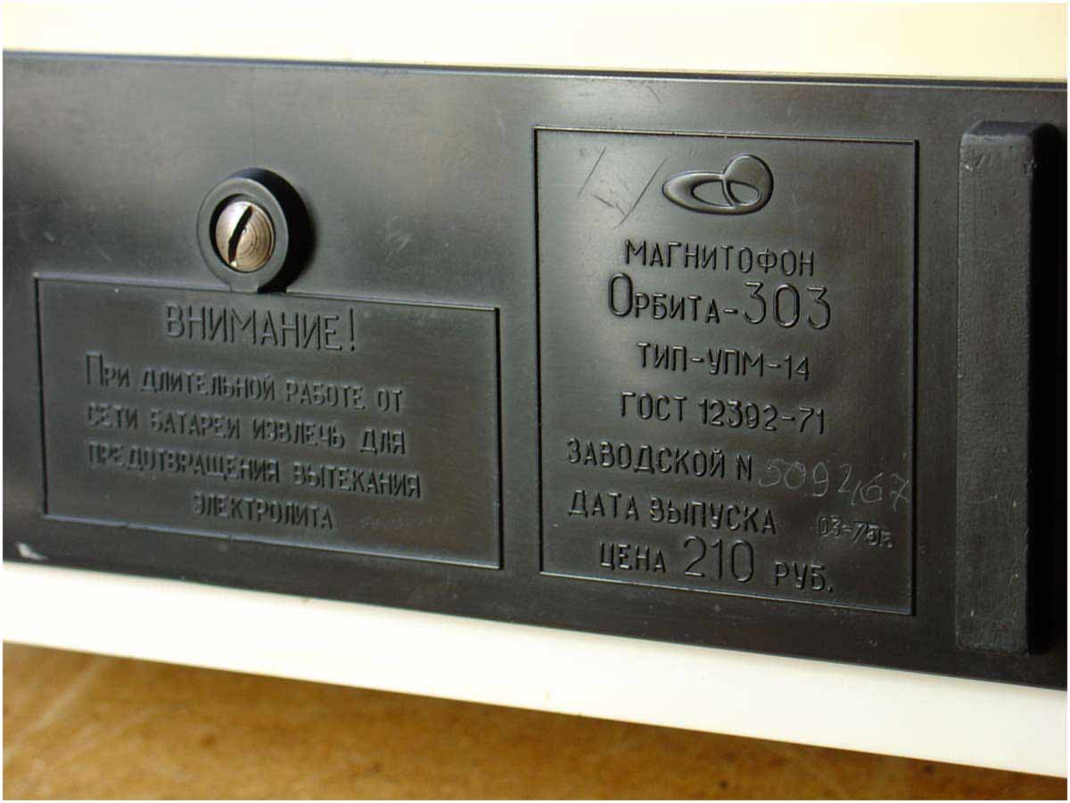 Портативный катушечный магнитофон *Орбита-303* с 1973 года выпускал Ленинградский завод *Пирометр*. Переносный четырехдорожечный катушечный магнитофон **Орбита-303** предназначен для записи фонограмм от микрофона, звукоснимателя приёмника, телевизора, радиолинии и их воспроизведение. В магнитофоне имеется возможность совместной работы с кино и диапроекторами. ЛПМ построен по двухмоторной кинематической схеме. Скорость протяжки ленты 9,5 см/сек. Время непрерывной записи при использовании катушек № 13 с магнитной лентой типа 10 - 4х45 мин. Номинальная выходная мощность 0,5 Вт. Полоса рабочих частот 63...10000 гц. Применён громкоговоритель 1ГД-28 или 1ГД-40. Питается магнитофон от 8 элементов 373 или электрической сети через приставку-выпрямитель БП-12/5. Размеры магнитофона - 310х210х105 мм, его масса 5 кг. Первые выпуски магнитофонов именовались как **Орбита-3**.