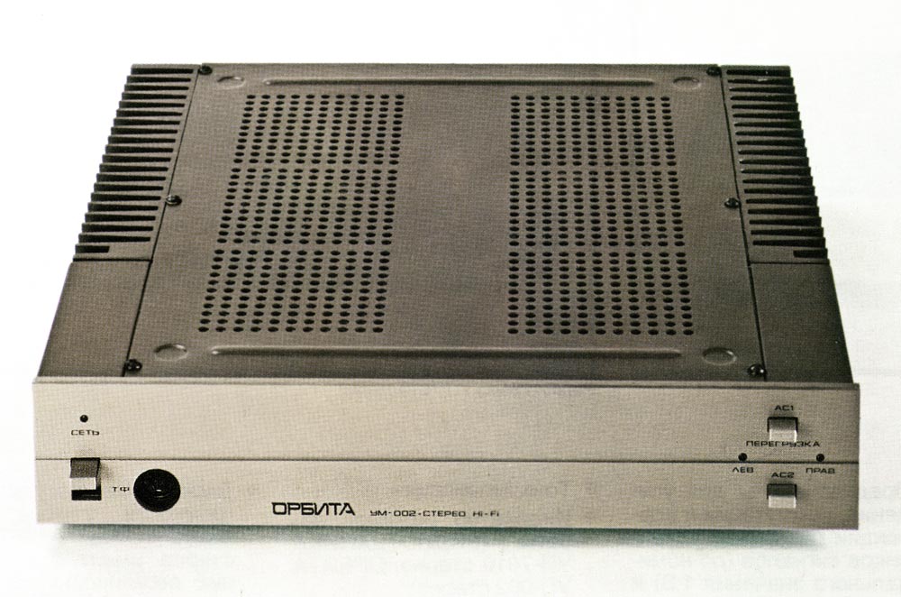 Усилитель предварительный **Орбита УП-002-стерео** и усилитель мощности *Орбита УМ-002-стерео* с 1985 года выпускал Ростовский завод *Электроаппарат*. Усилители входили в состав комплекса *Орбита-002-стерео*. УП предназначен для усиления стереофонического сигнала от звукоснимателя, электропроигрывателя, линейного выхода магнитофона, тюнера. Имеющееся коммутационное устройство позволяет подключить к усилителю два магнитофона для записи и перезаписи усиливаемых сигналов. Предусмотрена дискретная электронная регулировка громкости, оперативное уменьшение ее уровня, включение тонкомпенсации, регулировка тембра НЧ и ВЧ, световая индикация режимов работы, прослушивание фонограмм через стереотелефоны. УП может работать с активными АС и с УМ. Основные параметры: Диапазон усиливаемых частот при неравномерности АЧХ ±1 дБ - 20...20000 Гц. Номинальное выходное напряжение 1 В. Коэффициент гармоник 0,02%. Отношение сигнал, шум - 90 дБ. Потребляемая мощность 40 Вт. Габариты 320х320х60 мм. Масса 5 кг. Цена 520 рублей.
