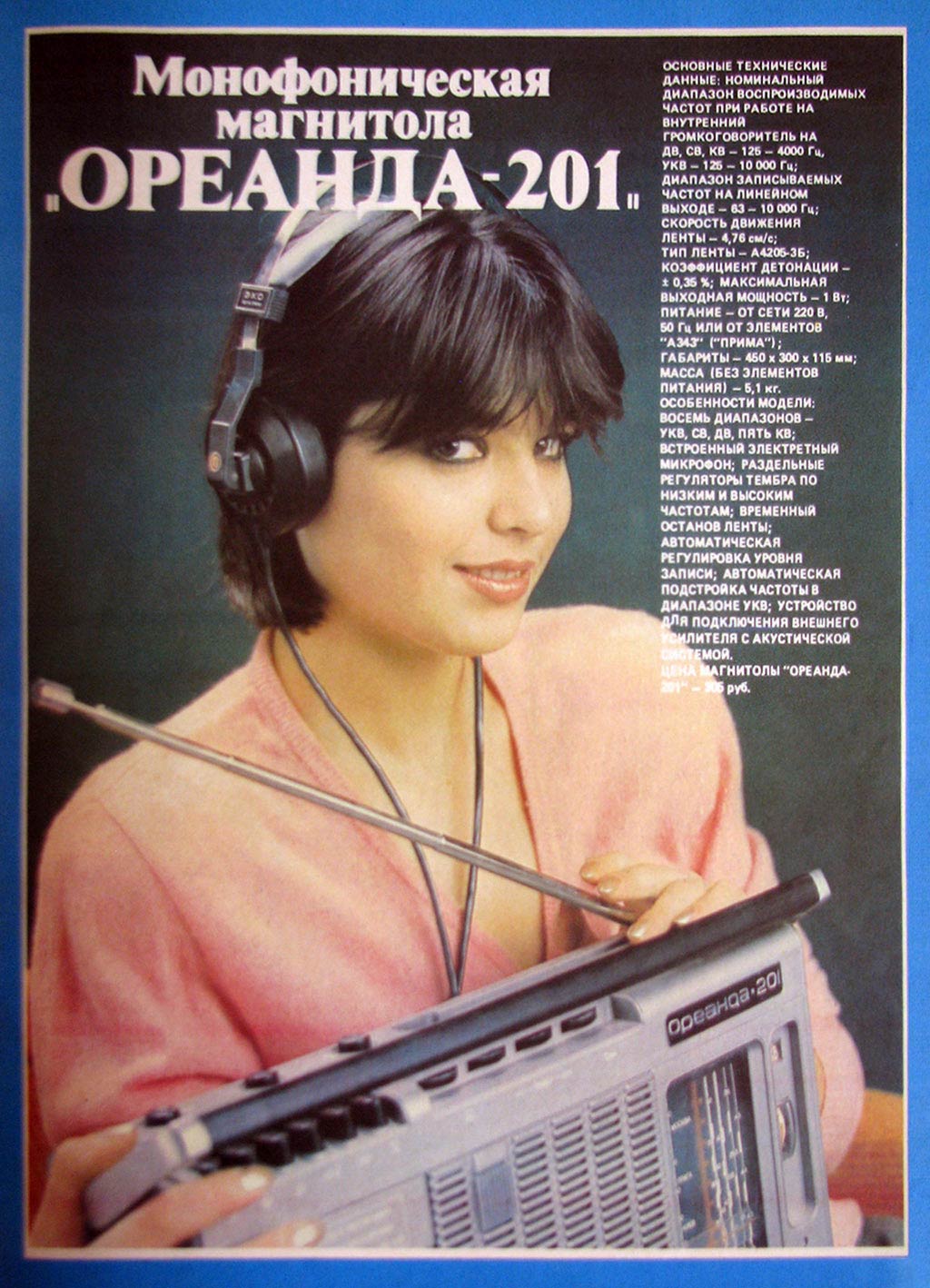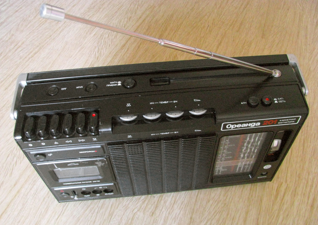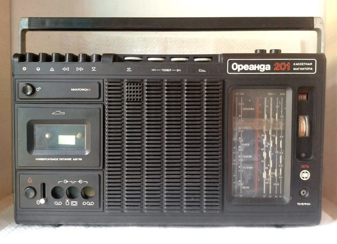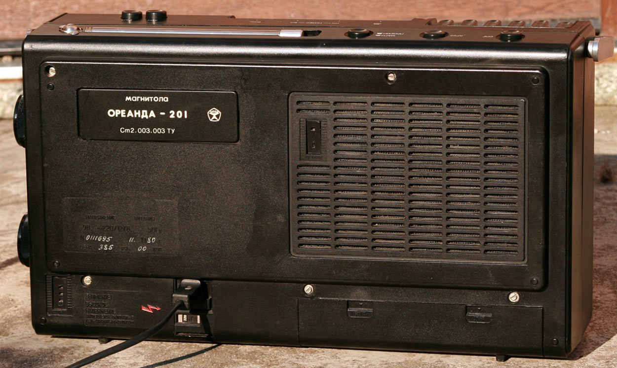Кассетная магнитола *Ореанда-201* с 1980 года выпускалась Симферопольским заводом *Фиолент*. **Ореанда-201** - магнитола 2 класса, состоящая из радиоприёмника 2-го класса и магнитофонной панели 3-го класса. Она предназначена для приёма программ радиостанций в диапазонах ДВ, СВ, KB и УКВ, а так же для магнитной записи на кассеты МК фонограмм со встроенного и выносного микрофонов, собственного и внешнего радиоприёмников, звукоснимателя и магнитофона с последующим воспроизведением. Приём в диапазонах ДВ и СВ осуществляется на магнитную антенну, а в KB и УКВ на телескопическую. Чувствительность в диапазонах ДВ 350, СВ 150, KB 50, УКВ 8 мкВ. Селективность 40 дБ. Избирательность по зеркальному каналу в диапазонах ДВ, СВ - 46, KB - 26 дБ. Номинальная выходная мощность 500 мВт, максимальная 750 мВт. Полоса воспроизводимых звуковых частот в тракте АМ 125...4000, ЧМ 125...10000 Гц. Среднее звуковое давление в полосе воспроизводимых частот - 0,31 Па. Напряжение на линейном выходе магнитофона 250 мВ. Диапазон частот на ЛВ 80...10000 Гц. Питание 7 элементов 343 или сеть. Габариты МЛ 450х245x118 мм. Вес с батареями 5,2 кг.