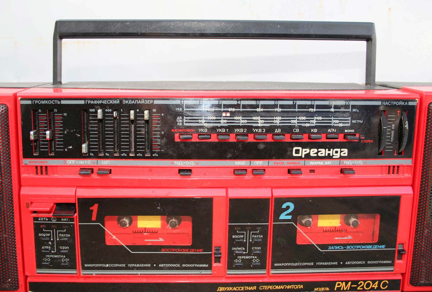 Стереофоническая магнитола *Ореанда РМ-204-С* с 1989 года выпускалась Симферопольским заводом *Фиолент*. Состоит из приёмника и двух ЛПМ, работающих один на воспроизведение, а другой на запись и воспроизведение. МЛ работает в диапазонах ДВ, СВ, KB и УКВ, обеспечивая запись фонограмм с последующим воспроизведением, перезапись с кассеты на кассету. Есть три фиксированные настройки, АПЧ в ЧМ диапазоне; БШН, переключение моно-стерео; АРУЗ; автопоиск фонограмм; изменение частоты ГС; эквалайзер; индикация сети и батарей, стереоприёма, режимов МП, расширение стереобазы съёмными АС. Имеются микрофоны, система ШП, переключатели типа ленты, счетчик расхода ленты. Управление ЛПМ микропроцессорное. Питание 9 элементов А-343 или электрическая сеть. Коэффициент детонации ±0,25%. Диапазон рабочих частот на ленте МЭК-1 - 40...12500 Гц, МЭК-2 - 40...14000 Гц. Диапазон частот в ЧМ - 125...10000 Гц. Максимальная выходная мощность 2х3,5 Вт. Потребляемая мощность 20 Вт. Габариты магнитолы - 680 х 182 х 182 мм. Масса - 6,3 кг.