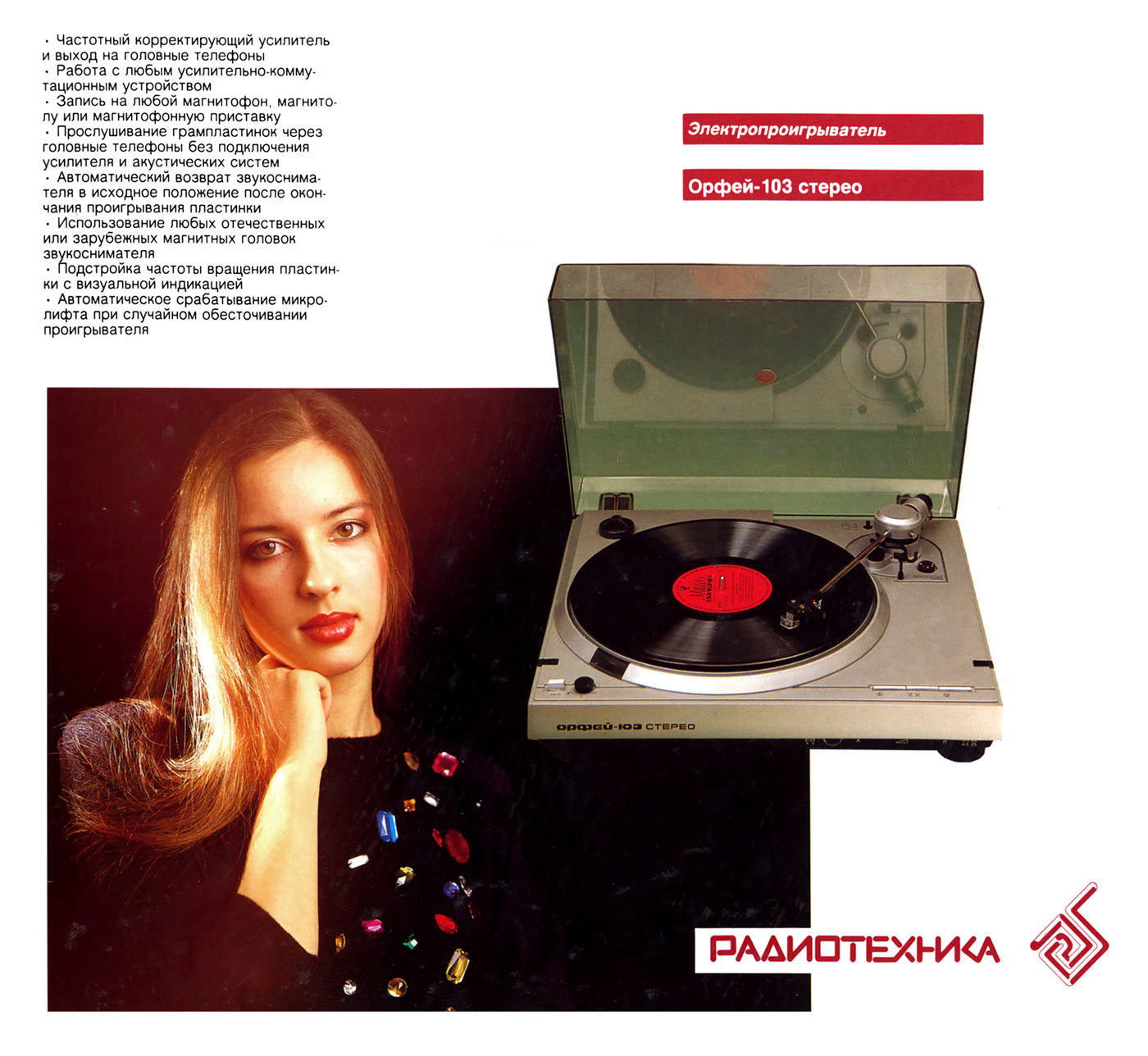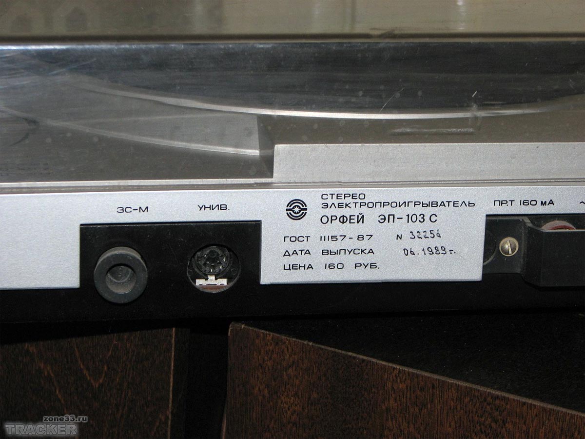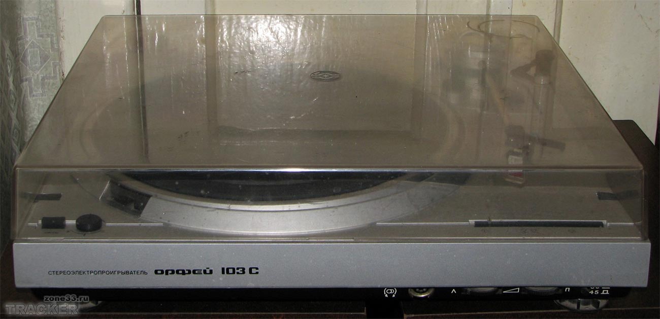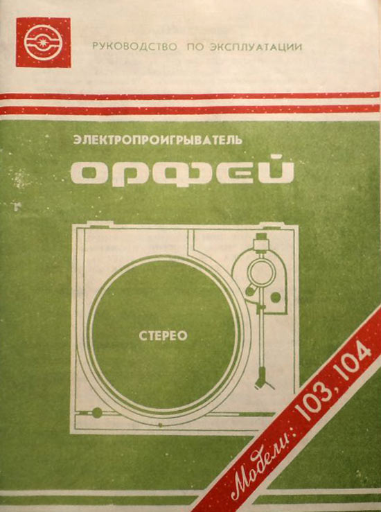 Электропроигрыватель *Орфей-103-стерео* с 1985 года выпускал Ижевский электромеханический завод. ЭП обеспечивает воспроизведение звукозаписи со стерео или монофонических грампластинок. Отличительные особенности проигрывателя - высокая стабильность частоты вращения диска, низкий уровень акустического шума, малые значения коэффициента детонации, широкий диапазон воспроизводимых частот, прослушивание грампластинок с помощью стереотелефонов, изолированный маятниковый подвес диска и звукоснимателя, использование различных магнитных головок звукоснимателя, не требует смазки в течение всего срока эксплуатации. ЭП имеет: сверх-тихоходный восьмиполюсный шаговый двигатель постоянного тока с пассиковым приводом; устройство точной подстройки частоты вращения диска со стробоскопическим индикатором, компенсатор скатывающей силы, регулятор прижимной силы, микролифт тонарма; возврат звукоснимателя в исходное положение, фотоэлектрический автостоп; встроенный, высококачественный усилитель НЧ, позволяющий прослушивать запись с пластинок на головные стереотелефоны. Частота вращения диска ЭП - 33 и 45 об/мин. Диапазон воспроизводимых звуковых частот 20...20000 Гц. Коэффициент детонации 0,12%. Относительный уровень рокота со взвешивающим фильтром -63 дБ. Прижимная сила звукоснимателя 18 мН. Потребляемая мощность 30 Вт. Габариты ЭП - 435х395х118 мм. Вес 9 кг. С 1987 года электропроигрыватель именовался как *Орфей ЭП-103-стерео*. С 1990 года завод подготовил к выпуску обновлённый электропроигрыватель *Орфей ЭП-104-стерео*, но в серию он не пошёл из-за нарастающих экономических проблем в стране.