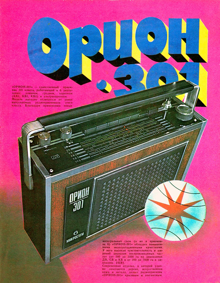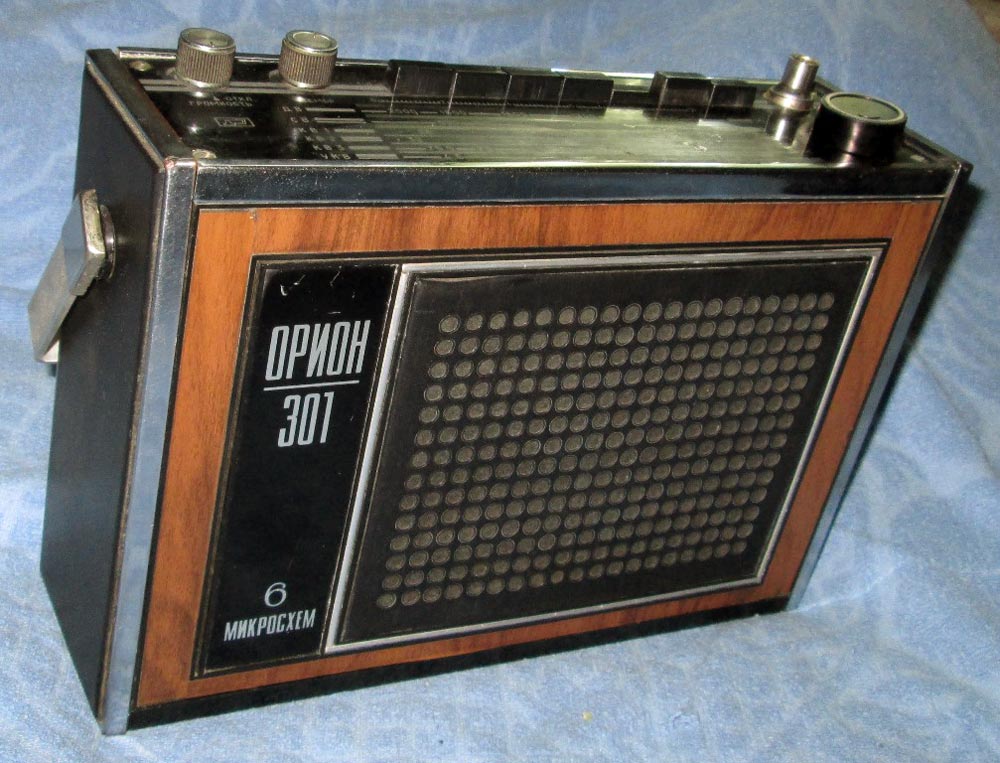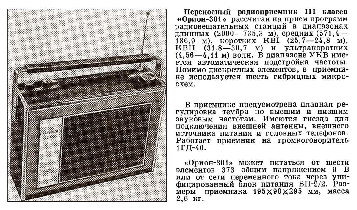 Переносный радиоприемник 3-го класса *Орион-301* с 1973 года выпускал Днепропетровский радиозавод. Приёмник работает в диапазонах: ДВ, СВ, KB-1 25,7...24,8 м, КВ-2 31,8...30,7 м и УКВ-ЧМ (АПЧ). Помимо транзисторов использовано шесть гибридных микросхем. В приёмнике имеются: плавная регулировка тембра по ВЧ; гнёзда внешней антенны, внешнего источника питания, головных телефонов. Громкоговоритель применён 1ГД-40. Питание от 6 элементов А-373 или от сети, через выносной унифицированный блок питания **БП-9/2**. Габариты радиоприёмника - 195х90х295 мм. Масса 2,6 кг.