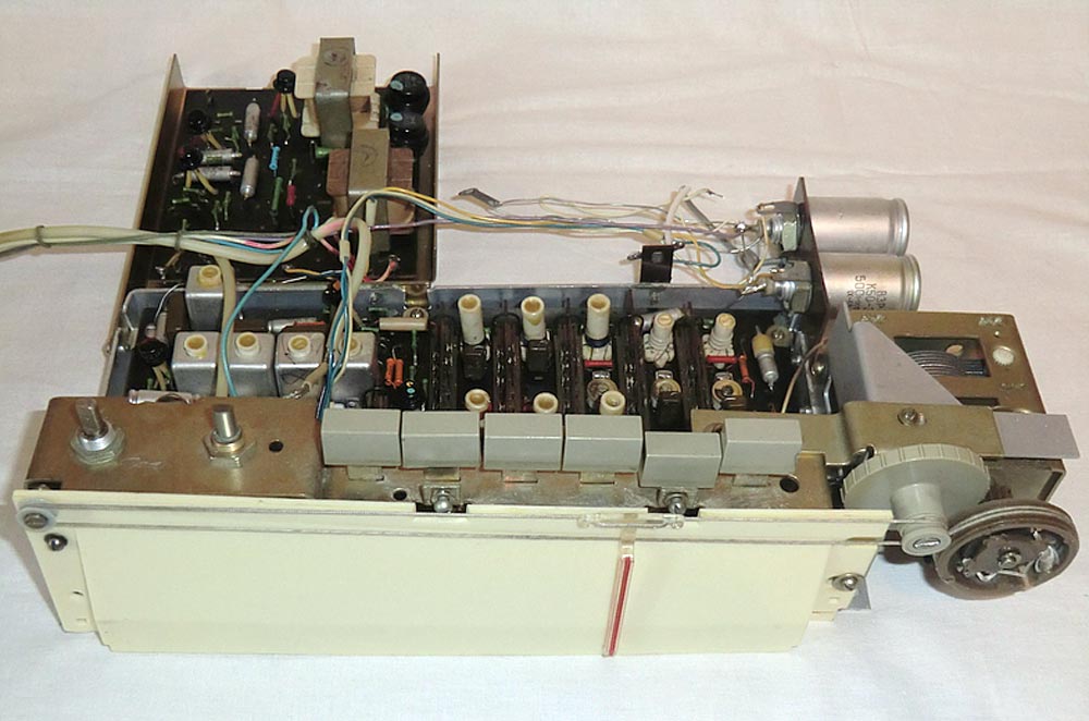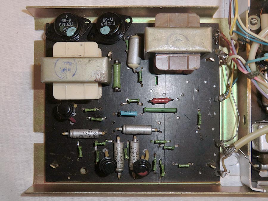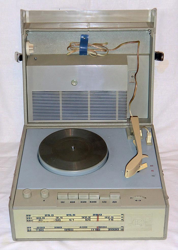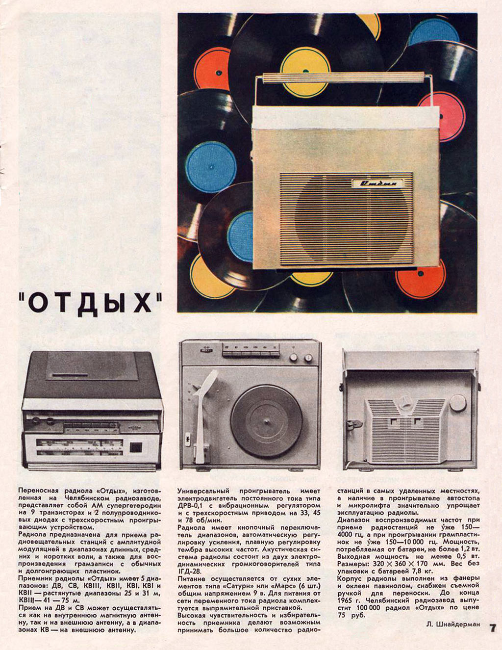 Переносная транзисторная радиола *Отдых* с 1965 года выпускалась Кыштымским радиозаводом. Радиола 2 класса с автономным питанием **Отдых** создана на базе шасси радиолы **Эфир-М** и представляет собой супергетеродин настольно-переносного типа, собранный на 9 транзисторах и совмещённый с ЭПУ. Радиола предназначена для приёма в диапазонах ДВ, СВ и КВ на наружную и внутреннюю магнитную антенны и воспроизведения грамзаписи. В диапазоне КВ приём ведётся от внешней антенны. Диапазон КВ разделен на 3 поддиапазона. ЭПУ имеет 3 скорости вращения диска. Чувствительность при работе от магнитной антенны: на ДВ 1,2 мВ/м, СВ 0,6 мВ/м. От внешней антенны: ДВ - 65 мкВ, СВ - 50 мкВ, КВ - 30 мкВ. Избирательность по соседнему каналу 36 дБ. Ослабление зеркального канала: ДВ - 40 дБ, СВ - 30 дБ, КВ - 15 дБ. ПЧ равна 465 кГц. Полоса воспроизводимых частот при приёме 150...4000 Гц, при воспроизведении грамзаписи 150...10000 Гц. Номинальная выходная мощность 500 мВт. Питание 6 батарей А-373. Потребляемый приёмником ток при отсутствии сигнала 14 мА. Работа приёмника сохраняется при снижении напряжения питания до 4 В. Длительность работы приёмника при средней громкости от элементов А-373 около 200 часов. Чувствительность со звукоснимателя при номинальной мощности 120 мВ. Габариты модели 320х340х160 мм. Масса 7,8 кг. Отделяемая закрывающаяся верхняя крышка радиолы является и акустической системой радиолы. Партия радиол выпускалась в комплекте с выносным блоком питания, поэтому такая модель называлась *Радиола на транзисторах *Отдых* с универсальным питанием*.