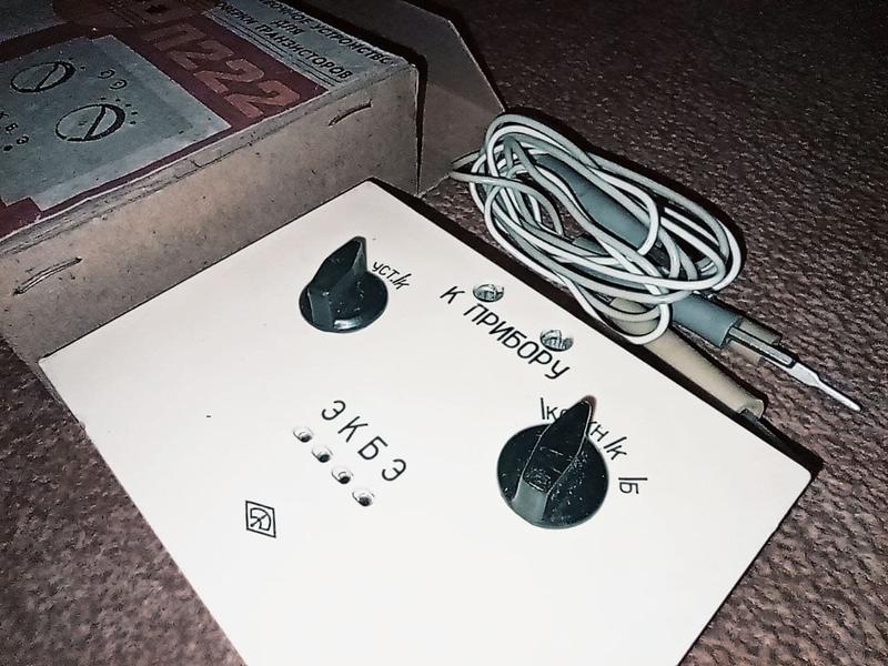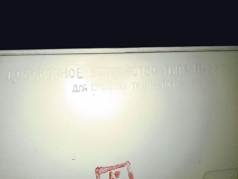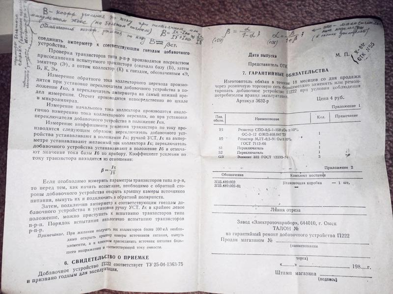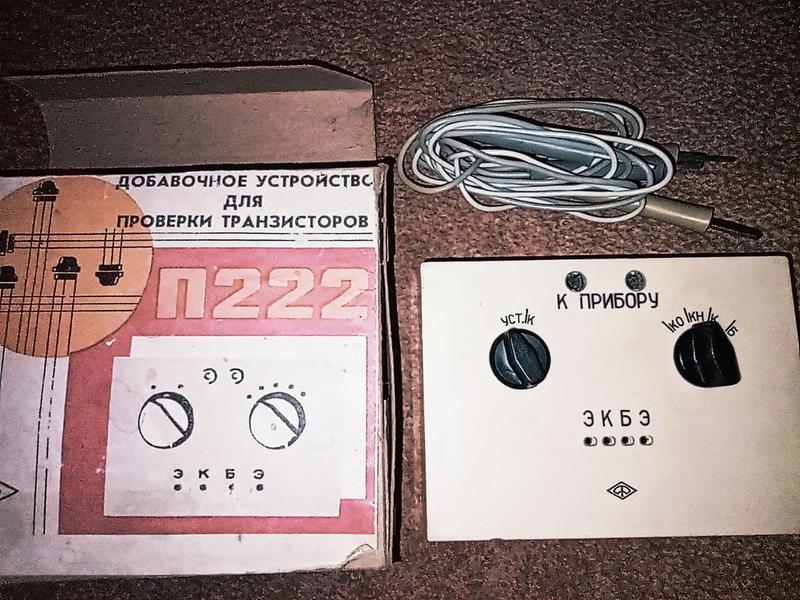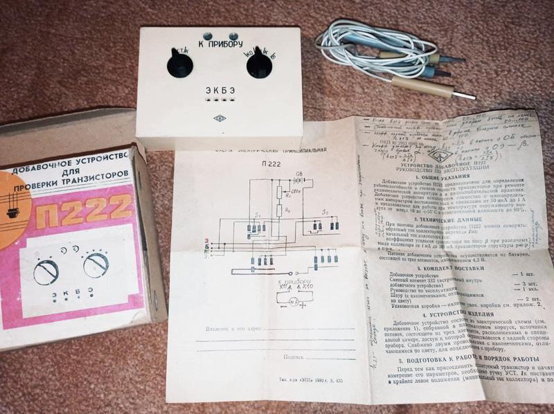 Добавочное устройство для проверки транзисторов *П-222* с 1973 года выпускал Омский завод *Электроточприбор*. Устройство предназначено для измерения исправности и параметров транзисторов прямой и обратной проводимости совместно с комбинированным прибором типа *Ц-20*. Недостаток устройства - смена полярности батарей при проверке транзисторов разной проводимости. Радиолюбители ставили переключатель полярности батарей между ручками устройства.