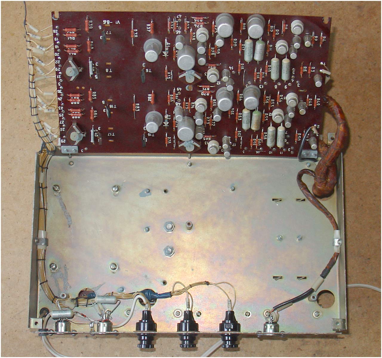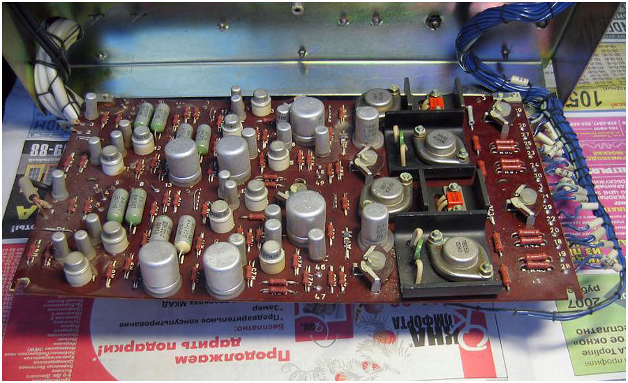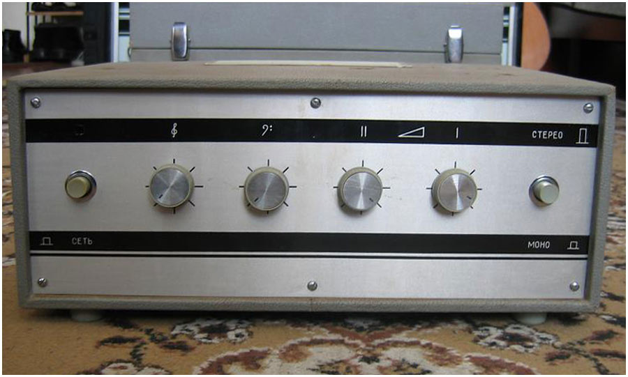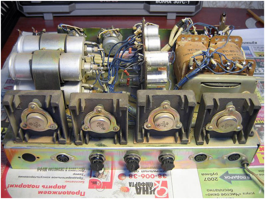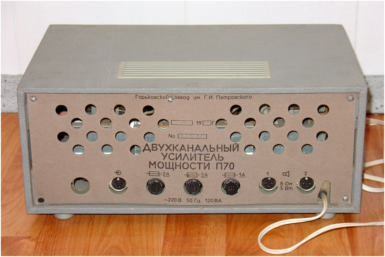 Двухканальный усилитель мощности *П-70* с 1982 года выпускал Горьковский завод имени Петровского. Двухканальный усилитель мощности **П-70** предназначен для воспроизведения моно и стереофонических фонограмм с магнитофонов **Тембр-2**, **Тембр-2С** и **Тембр-2М**. Усилитель представляет собой аппарат в настольном оформлении, размещённый в деревянном корпусе и оклеенном декоративным материалом. Усилитель комплектуется акустическими системами ВГ-2-3/16Р. Усилитель продавался и как отдельное самостоятельное устройство. В середине 1985 года усилитель **П-70** был существенно модернизирован. При прежнем оформлении была переработана электрическая схема, в соответствии с ней и конструкция. Технические характеристики: Номинальная выходная мощность усилителя 2х5 Вт, максимальная 2х9 Вт. Диапазон рабочих частот звука на выходе для АС 40...20000 Гц. Относительный уровень помех по каждому каналу -50 дБ. Диапазон регулировки темра по низким частотам +8 дБ, по высоким -10 дБ. Коэффициент искажений при номинальной мощности 3%. Потребляемая от сети мощность 120 Вт. Габариты модели - 400х250х200 мм. Вес 10 кг.