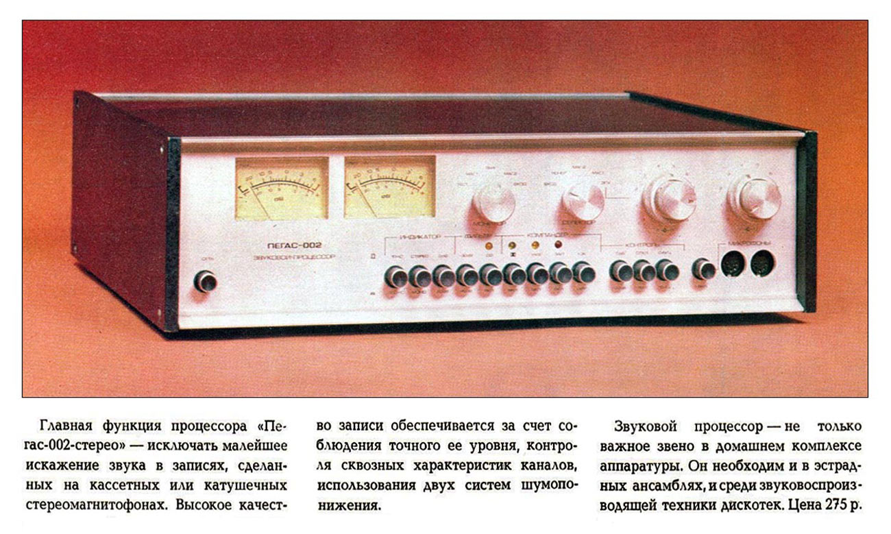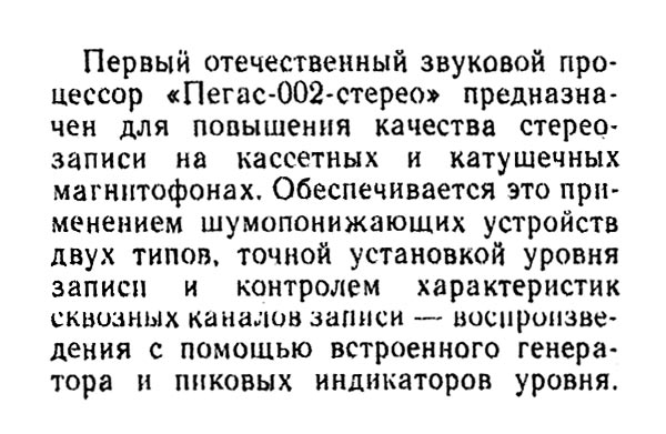 Звуковой процессор *Пегас-002-стерео* подготовлен к выпуску с 1983 года. Скорее всего по каким-то причинам в производство он не пошёл, так как в интернете о нём практически нет информации. Рекламный проспект взят из каталога *Товары народного потребления за 1984 год, а краткое описание из журнала Радио №2 за 1983 год.