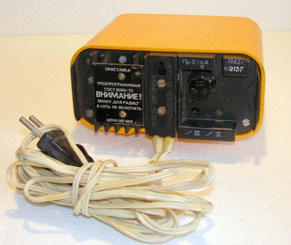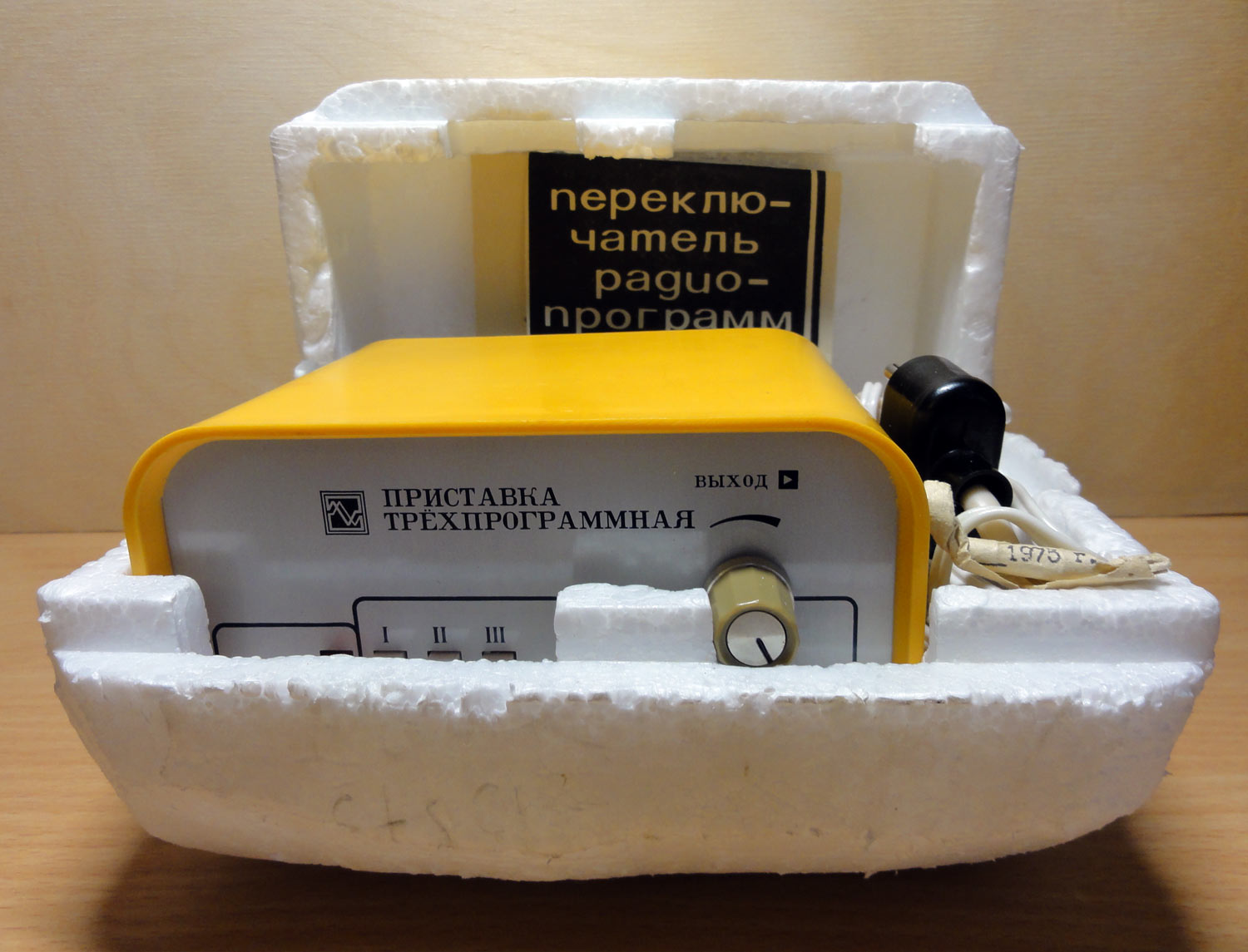 Приставка трёхпрограммная *Переключатель радиопрограмм* с 1982 года выпускалась Курским завод *Маяк*. Приставка трёхпрограммная предназначена для воспроизведения любой из трёх радиопрограмм, передаваемых по уплотнённой радиотрансляционной линии совместно с любым абонентским громкоговорителем.