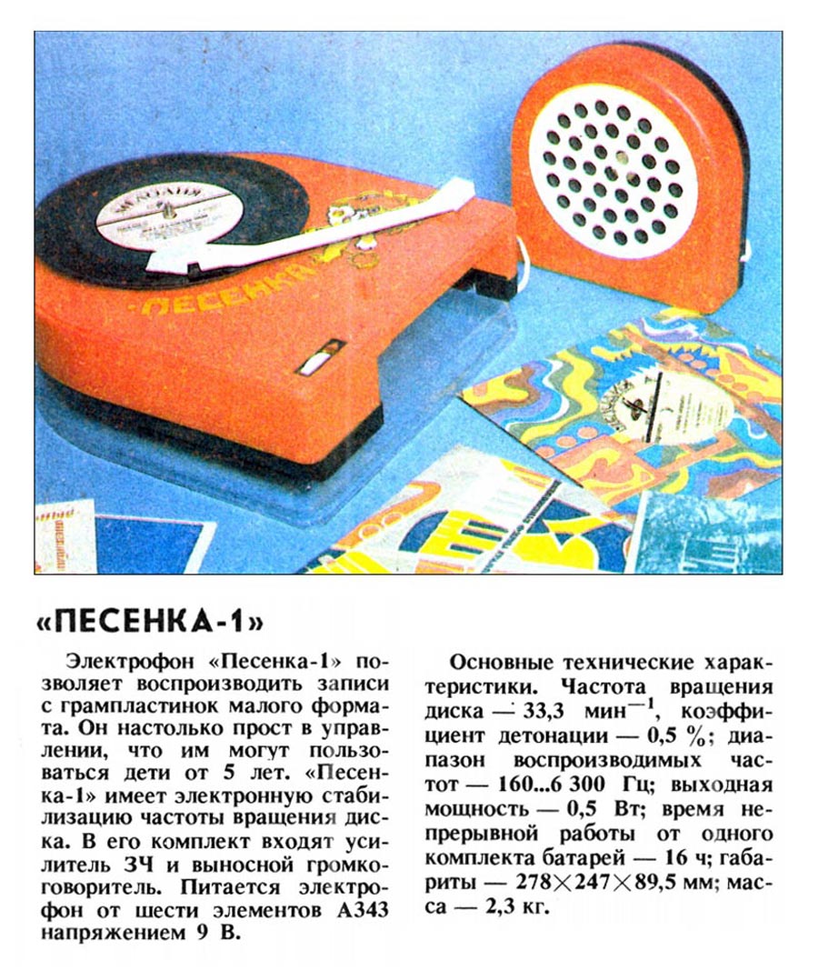 Электрофон детский транзисторный *Песенка-1* с начала 1991 года выпускал Гомельский радиозавод имени 60-летия СССР. Электрофон - игрушка **Песенка-1** позволяет воспроизводить грампластинки любых форматов. Электрофон очень прост в управлении и им могут пользоваться дети с 5-ти лет. Электрофон имеет электронную стабилизацию частоты вращения диска. В комплект входят транзисторный усилитель НЧ и выносной громкоговоритель (АС). Звукосниматель типа ГЗК-661. Питание от 6 элементов А-343. Скорость вращения диска - 33 об/мин. Коэффициент детонации 0,5%. Диапазон частот воспроизводимых АС 160...6300 Гц. Максимальная выходная мощность - 0,5 Вт. Время работы от комплекта батарей около 16 часов. Габариты электрофона - 278х247х89,5 мм. Его масса - 2 кг.