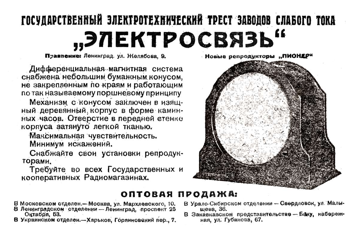Абонентский громкоговоритель "Пионер" с 1929 года выпускал Ленинградский электромеханический завод имени Кулакова. Конструкция абонентского громкоговорителя "Пионер" сходна с репродуктором "Рекорд". Устройство громкоговорителя простое. Фибровый или бумажный диффузор укреплён в основании футляра и совмещён с электромагнитным механизмом. Сзади корпуса громкоговорителя установлен механический регулятор громкости.