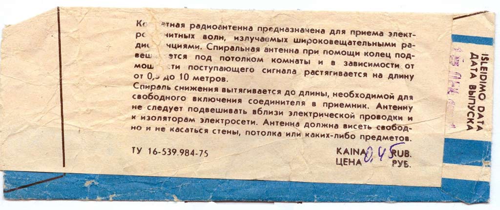 Спиральная комнатная антенна выпускалась предположительно с 1977 года заводом *Lietkabelis*, город Паневежис, Литовская ССР. Антенна предназначена для приёма электромагнитных волн радиовещательных станций во всех вещательных диапазонах. Антенна имеет длину 0,5 метра, но растягивается до 10 метров.