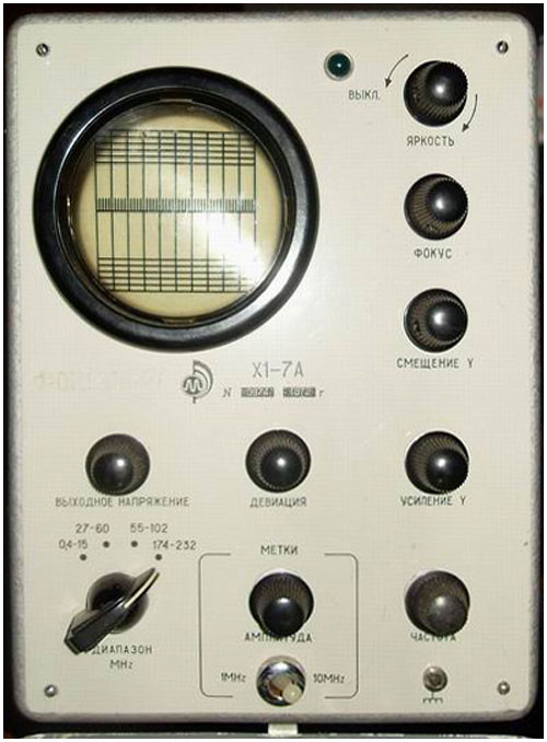 Прибор для настройки телевизоров *ПНТ-59* выпускался с 1959 года. Он предназначен для визуального просмотра АЧХ радиотелевизионных устройств и представляет собой сочетание четырехдиапазонного генератора качающейся частоты, маркерного генератора и осциллографического устройства. С помощью прибора *ПНТ-59* можно просматривать частотные характеристики видеоусилителей, усилителей промежуточной частоты видeo и звукового каналов, частотного детектора, усилителей высокой частоты, блоков ПТП, ПТК и УКВ ЧМ, контролировать согласование антенного кабеля с входом телевизора и антенной, определять волновое сопротивление высокочастотного коаксиального кабеля. Частоты ГКЧ: (0,4...15), (27...60), (55...102), (174...232) МГц. U вых = (50...250) мВ. Чувствительность 0,4 мм/мВ. С 1963 года выпускался полный аналог прибора, под наименованием измеритель частотных характеристик *Х1-7*, а с 1971 года модернизированный вариант *Х1-7А*. По нём информации нет, но скорее всего это так же аналог предыдущих приборов.