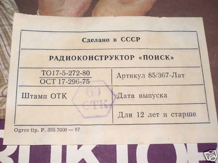 Радиоконструктор *Поиск* выпускался с 1987 года в Латвии. Из радиоконструктора на специальной монтажной плате из деталей входящих в комплект и по приложенным электрическим и монтажным схемам можно собрать десять вариантов различных радиоустройств. Одиннадцатой конструкцией, которая собиралась последней был малогабаритный радиоприёмник прямого усиления, куда входили корпус, некоторые радиодетали и элементы предыдущих конструкций, а так же отдельная печатная плата со схемой и описанием для сборки в общей инструкции радиоконструктора.