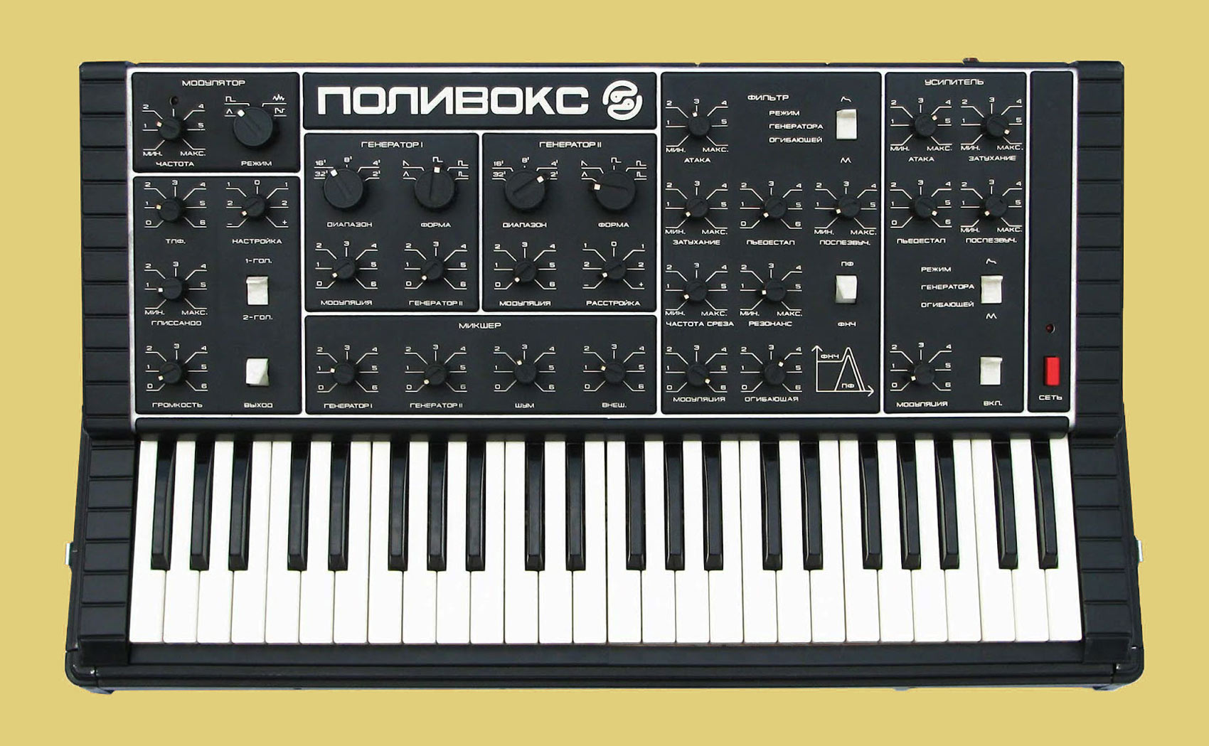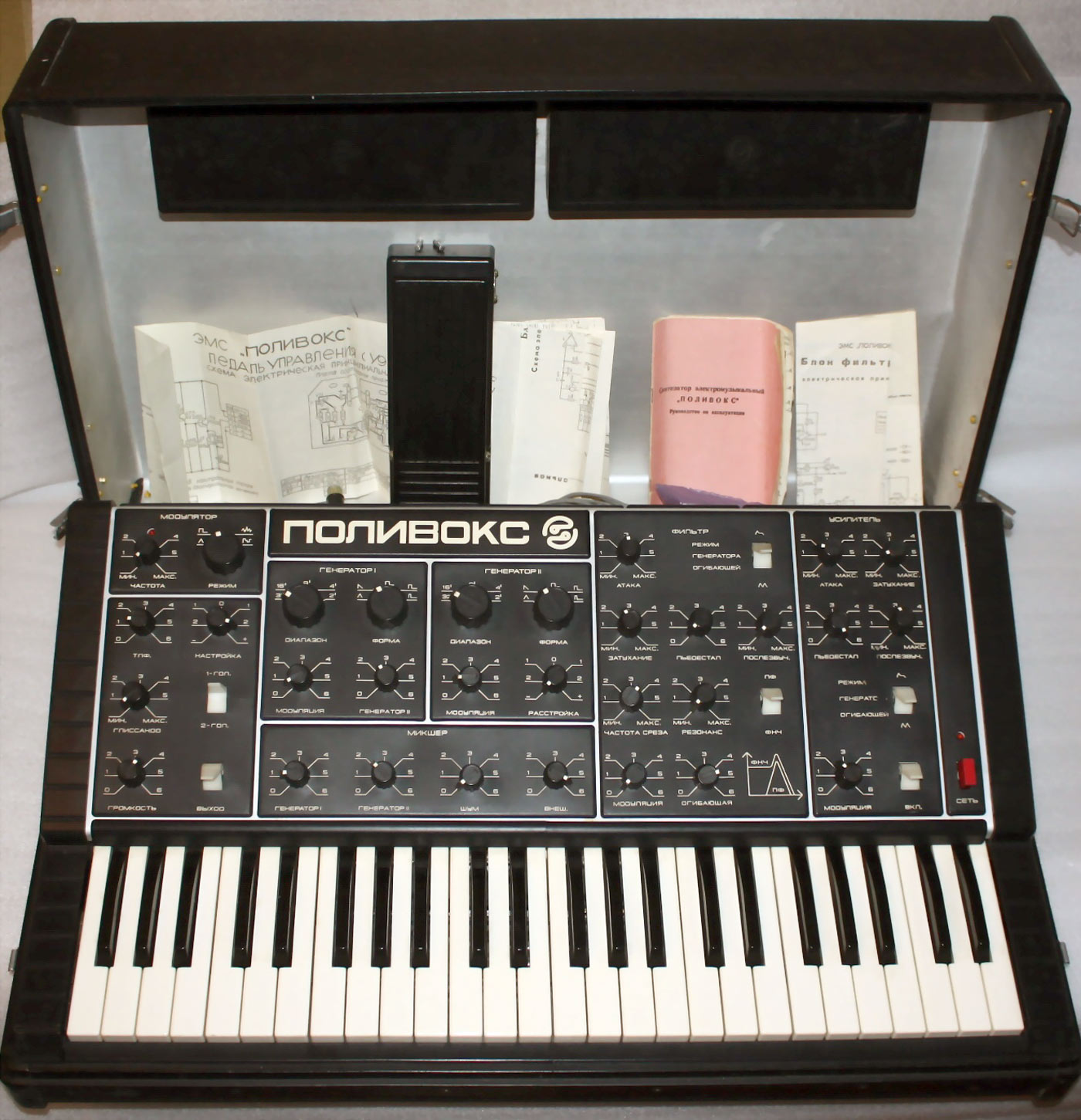 Электромузыкальный синтезатор *Поливокс* выпускался возможно с 1982 года Муромским заводом *РИП*. Синтезатор служит для исполнения одно и двухголосных партий в составе музыкальных групп, для синтезирования звуковых эффектов на эстраде, студиях звукозаписи, радиовещания и телевидения. Синтезатор состоит из двух генераторов ЗЧ; генератора шума; фильтра, управляемого напряжением усилителя, 2-х генераторов огибающей; генератора инфранизких частот. Работой блоков можно оперативно управлять вручную и автоматически. Взаимодействие блоков между собой дает изменение любых параметров электрических колебаний, что позволяет музыканту-исполнителю получать неисчислимые оттенки звука, или им задуманные или имеющиеся в природе («ветер», «морской прибой», «перестрелка», «дождь», «паровоз» и др.) а также имитировать звучание различных музыкальных инструментов. Блоки синтезатора выполнены отдельными печатными узлами, установленными с помощью разъемов на общую печатную плату, где установлены и органы управления. Объем клавиатуры, октав четыре. Диапазон звучания (от «ФА» субконтроктавы до «МИ» пятой октавы), октав 8. Диапазон перестройки фильтра 20...20000 Гц. Питание от сети 220 В. Масса синтезатора 15 кг. Цена 920 рублей.