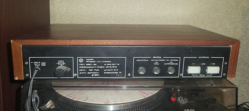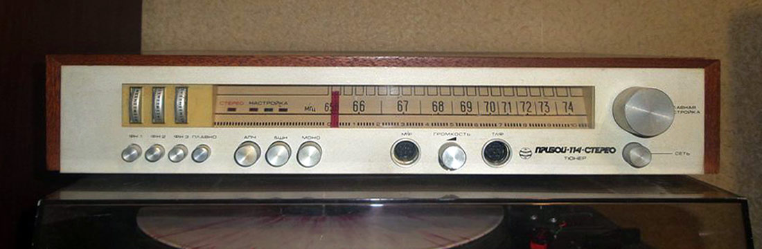 Тюнер *Прибой-114-стерео* с 1985 года выпускал Таганрогский завод *Прибой*. Тюнер предназначен для приёма моно и стереофонических программ в диапазоне УКВ. Ряд потребительских и эксплуатационных удобств впервые введены в этот тюнер. Это возможность отключения системы БШН и автоматического переключения из режима *Моно* в режим *Стерео*, регулировка громкости при прослушивании программ на головные телефоны, световая индикация режима *Стерео* и точной настройки. Розетки для головных телефонов и магнитофона на запись вынесены на переднюю панель тюнера. Чувствительность тюнера 3 мкВ. Диапазон рабочих частот звука на линейном выходе 40...15000 Гц.