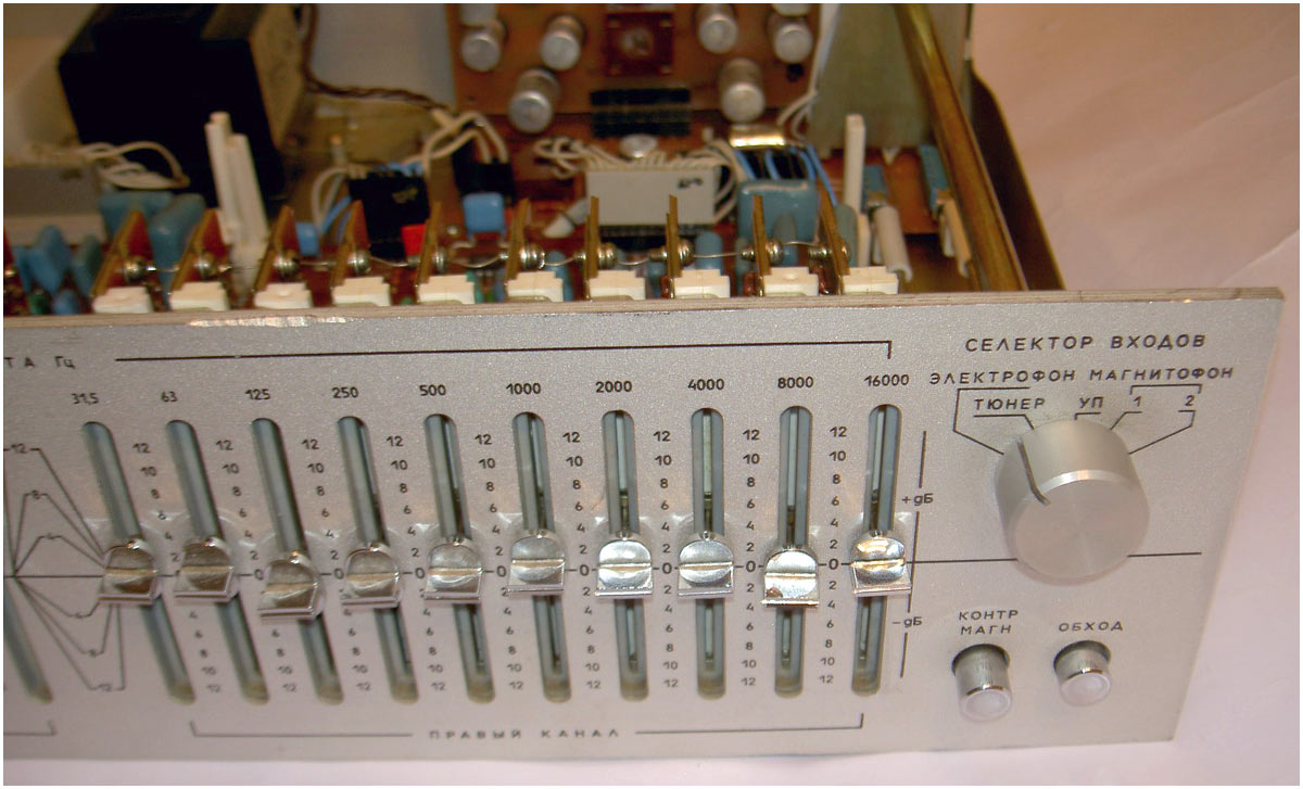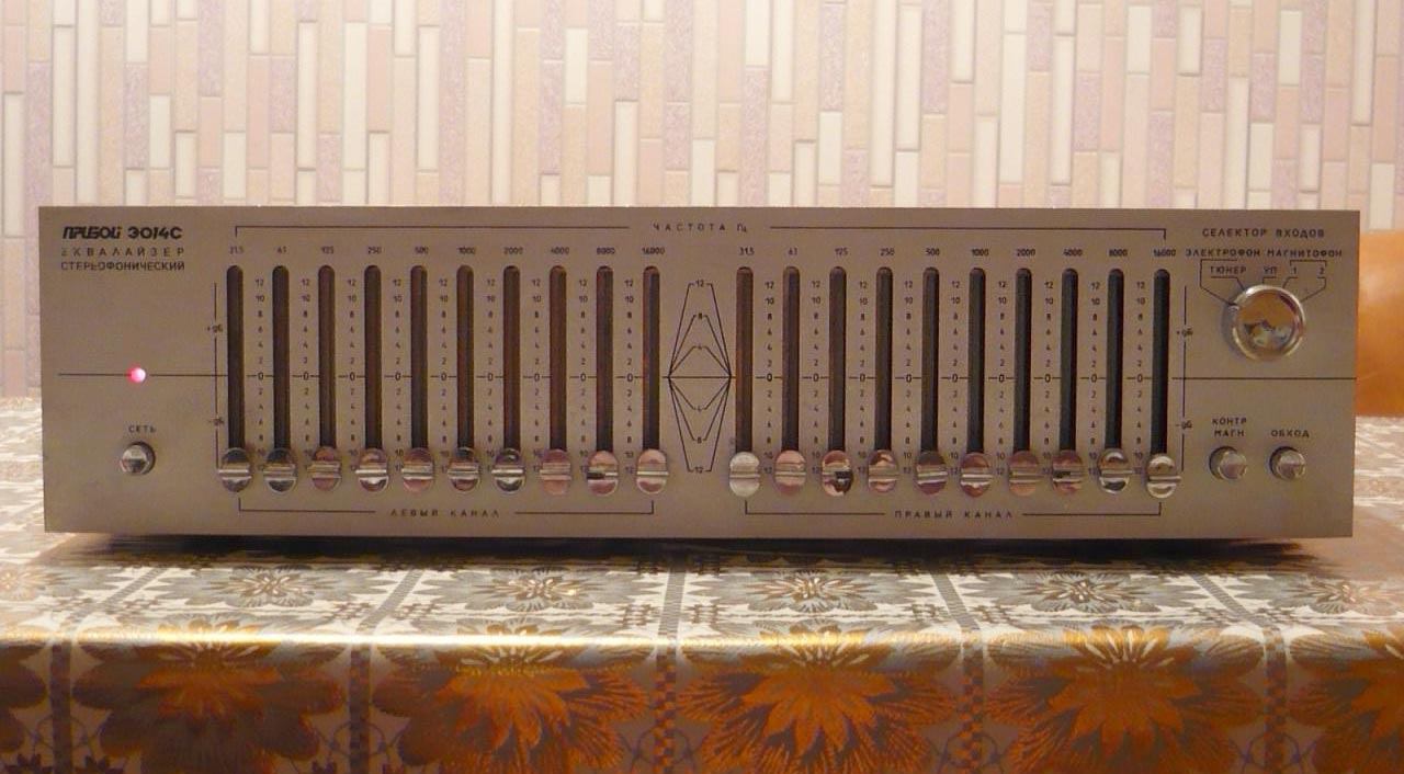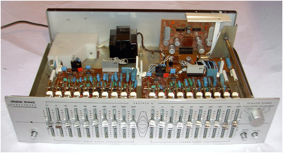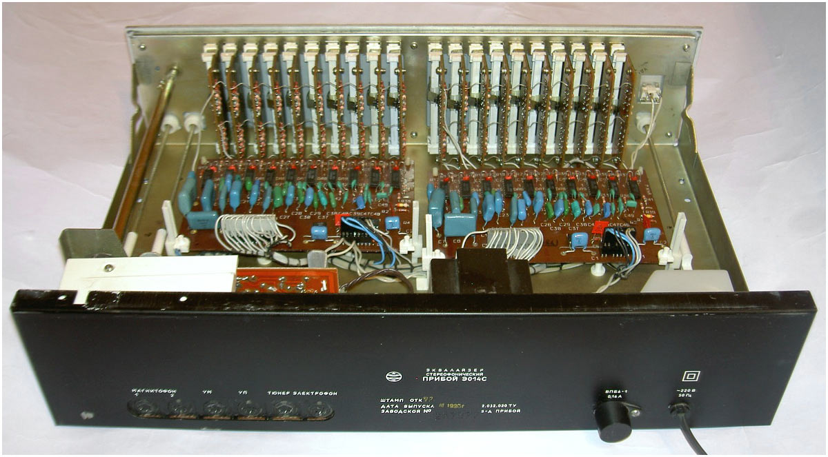 Стереофонический эквалайзер *Прибой Э-014С* с I-кв 1988 года выпускал Таганрогский завод *Прибой*. Стереофонический двухканальный, десятиполосный, графический эквалайзер **Прибой Э-014С** предназначен для регулировки амплитудно-частототных характеристик моно или стереофонических фонограмм с различных источников сигналов, в октавном ряду: 31.5, 63, 125, 250, 500, 1000, 2000, 4000, 8000, 16000 Гц. Дискретные резисторы ползункового типа позволяют получить графическую картину АЧХ, формируемую эквалайзером. Эквалайзер имеет минимальный уровень собственных шумов и искажений. В эквалайзере имеется переключатель входов и кнопка для обхода, позволяющая сравнивать фонограмму до и после эквалайзера. Эквалайзер питается от сети, потребляя мощность 5 Вт. С I-кв 1992 года завод выпускал эквалайзер **Прибой Э-015С** по электрической схеме аналогичный данному, однако какое оформление имел этот эквалайзер, неизвестно.
