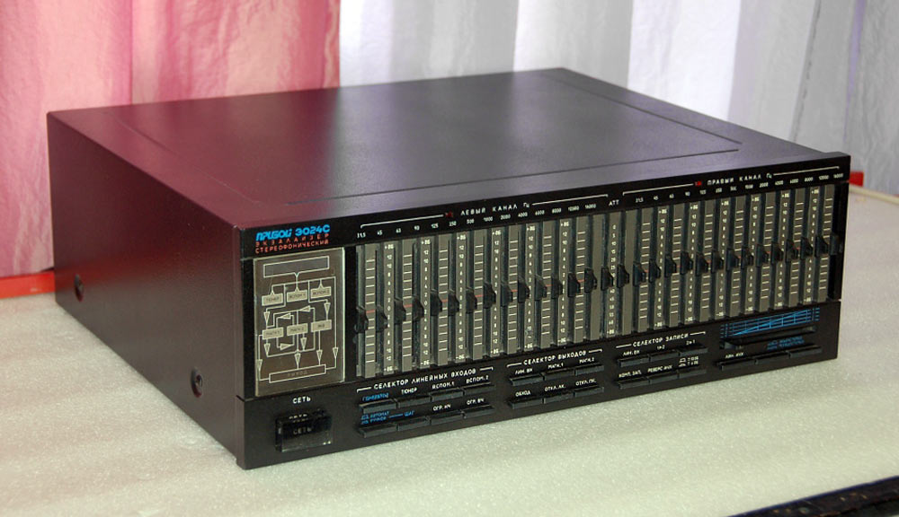 Стереофонический графический эквалайзер *Прибой Э-024С* с I-кв 1991 года выпускал Таганрогский завод Прибой. Стереофонический двухканальный 14-ти полосный графический эквалайзер **Прибой Э-024С** предназначен для оперативной регулировки амплитудно-частототных характеристик моно или стереофонических фонограмм с различных источников в октавном ряду 31,5, 45, 63, 90, 125, 250, 500, 1000, 2000, 4000, 6000, 8000, 12000 и 16000 Гц. Дискретные резисторы ползункового типа позволяют получить графическую картину АЧХ эквалайзера. Эквалайзер имеет минимальный уровень шумов. В нём имеется переключатель входов и кнопка обхода, позволяющая сравнивать фонограмму до и после эквалайзера. Потребляемая мощность 10 Вт.