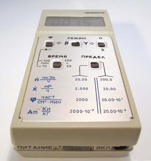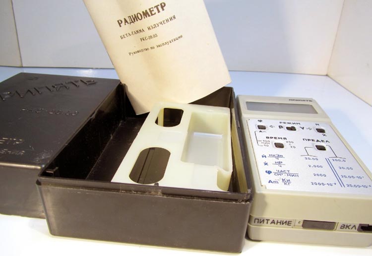 Бытовой радиометр *Припять* (РКС-20.03/1) выпускался с 1991 года. Предназначен для контроля радиационной обстановки в местах проживания и деятельности населения, а также контроля наличия радиоактивных веществ в продуктах питания и пробах внешней среды, других жидких и сыпучих веществах. Для определения радиационной чистоты жилых и производственных помещений, приусадебных участков, строqматериалов, металлолома и транспорта предназначена модификация радиометра РКС-20.03/1. С помощью радиометра можно измерять: мощность экспозиционной дозы гамма и рентгеновского излучений; мощность эквивалентной дозы гамма и рентгеновского излучений; плотность потока бета-частиц; удельную активность нуклидов в продуктах питания, жидких и сыпучих веществах; радиометр может подавать звуковые сигналы о наличии радиационного излучения. Технические характеристики: Мощность экспозиционной дозы гамма и рентгеновского излучений, мР/ч – 0,01…20,00. Мощность эквивалентной дозы гамма и рентгеновского излучений, мкЗв/ч 0,1…200,0. Плотность потока бета-излучения, част/см2 • мин 5…20 • 103. Удельная активность (по изотопу цезий 137), Бк/кг (Бк/л) 3,7 • 103…7,4 • 105. Объемная активность, Ки/кг (Ки/л) 1 • 10-7…2 • 10-5.