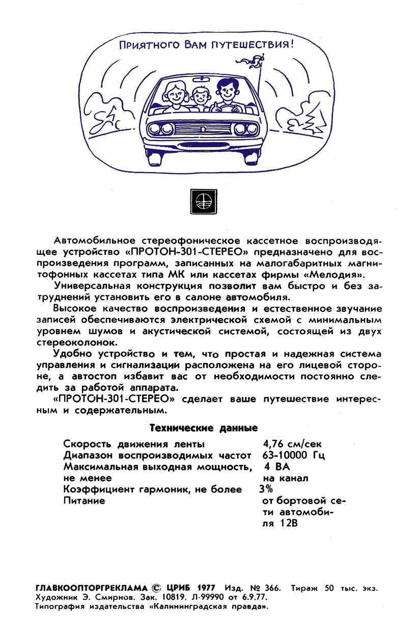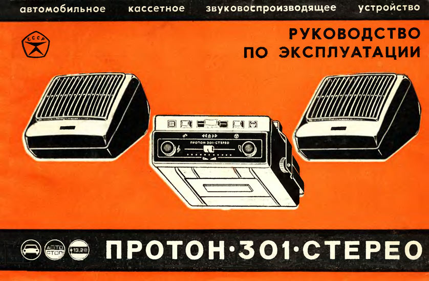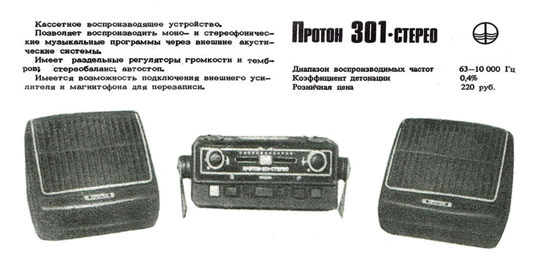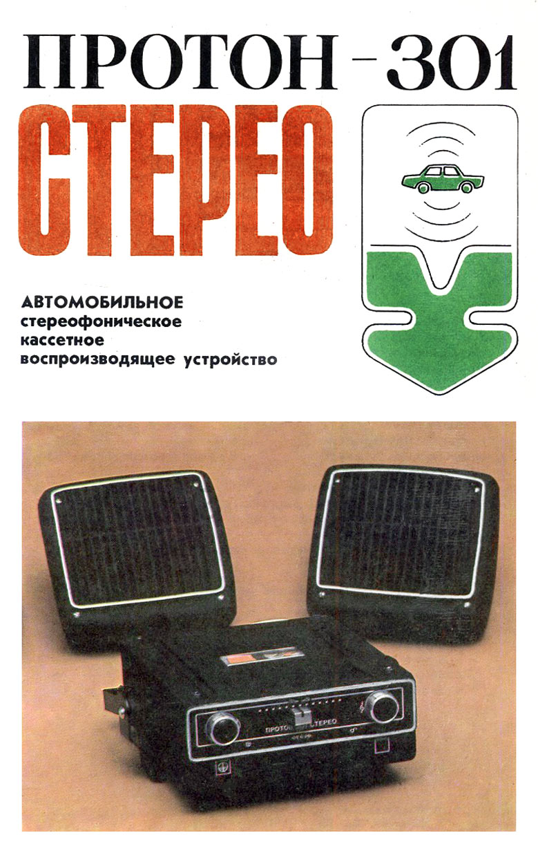 Автомобильное воспроизводящее устройство *Протон-301-стерео* с 1977 года выпускал Харьковский завод *Протон*. Предназначено для установки в автомобили Жигули, Москвич и Волга. Рассчитано на воспроизведение моно и стерео фонограмм с кассет МК. ЛПМ выполнен на базе ЛПМ магнитофона *Спутник-403*, обеспечивающего ускоренную перемотку ленты и автоматическое выключение ЛПМ по окончании кассеты. В АВУ имеется регулировка громкости, тембра ВЧ, стереобаланса, индикация включения. Работает АВУ на две АС в каждой из которых установлено по головке 4ГД-8Е. Скорость ленты 4,76 см/с. Время воспроизведения кассеты 2х30 мин. Коэффициент детонации ЛПМ ±0,4%. Номинальная выходная мощность 2х2 Вт. Диапазон рабочих частот 63...10000 Гц. Мощность, потребляемая от аккамулятора 23 Вт. Габариты АВУ - 225х72х212, АС - 100х148х160. Масса АВУ 3 кг, АС 1 кг. Цена АВУ 220 рублей.