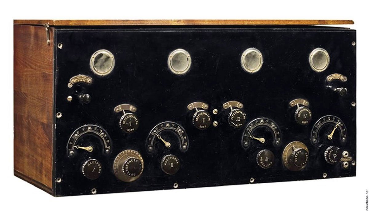 Радиоприёмник батарейный *ПРТ-4* выпускал с начала 1930 года трест *Электросвязь*. *ПРТ-4* - (Приёмник Радио-Трансляционный, 4-х ламповый) предназначается для обслуживания трансляционных устройств проволочных вещательных узлов. Диапазон волн приёмника: 180...2175 м (1667...138 кгц). Приём может вестись как на открытую, так и на рамочную антенны. Приёмник имеет три каскада усиления высокой частоты и регенеративный детекторный каскад. ВЧ радиоприёмника представляет трёхкаскадный резонансный усилитель с трансформаторными междуламповыми связями. Настройка каждого контура осуществляется изменением ёмкости переменного конденсатора, а также сменой комплекта трансформаторов высокой частоты и переходом с одной секции вторичной обмотки на две с помощью переключателя. Обратная связь индуктивная на 4-й резонансный контур. Детектирование производится при помощи гридлика. Регулировка усиления выполняется с помощью потенциометра изменяющего смещение на сетках ламп, усиливающих высокую частоту. Приёмник рассчитан для работы на лампах ПТ-2 во всех каскадах, но может работать и на лампах УБ-107 или УБ-110. Для питания требуются два аккумулятора напряжением 4 и 80 В.