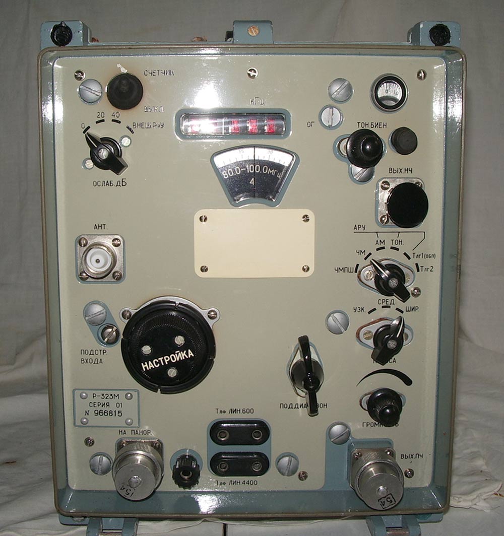Армейский ламповый КВ-УКВ радиоприёмник *Р-323М* (Цифра-М) выпускался с 1978 года. **Р-323М** предназначен для приёма телеграфных сигналов и сигналов с амплитудной и частотной модуляцией. Радиоприемник собран по схеме супергетеродина, с двумя преобразованиями частоты. Имеет четыре поддиапазона. Индикация частоты осуществляется с помощью светодиодных индикаторов. Полоса пропускания переключаемая, имеет три положения. Регулировки усиления приёмник не имеет. По входу есть ступенчатый аттенюатор с ослаблением 0, 20 и 40 dB. По внешнему виду этот радиоприёмник схож с приёмником **Р-326М**,отличие в диапазоне принимаемых частот. Основные технические характеристики: Диапазон принимаемых частот 20...100 МГц. Формирование/установка частоты - плавный гетеродин (LC генератор). Чувствительность в режиме АМ (узкая/широкая полоса) - 3/5 мкВ, FM - 2,5 мкВ, CW 1 мкВ. Ослабление по зеркальному каналу не менее 800 раз. Номинальное напряжение питания - 12 В. Габариные размеры - 255х270х370 мм.