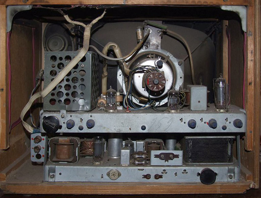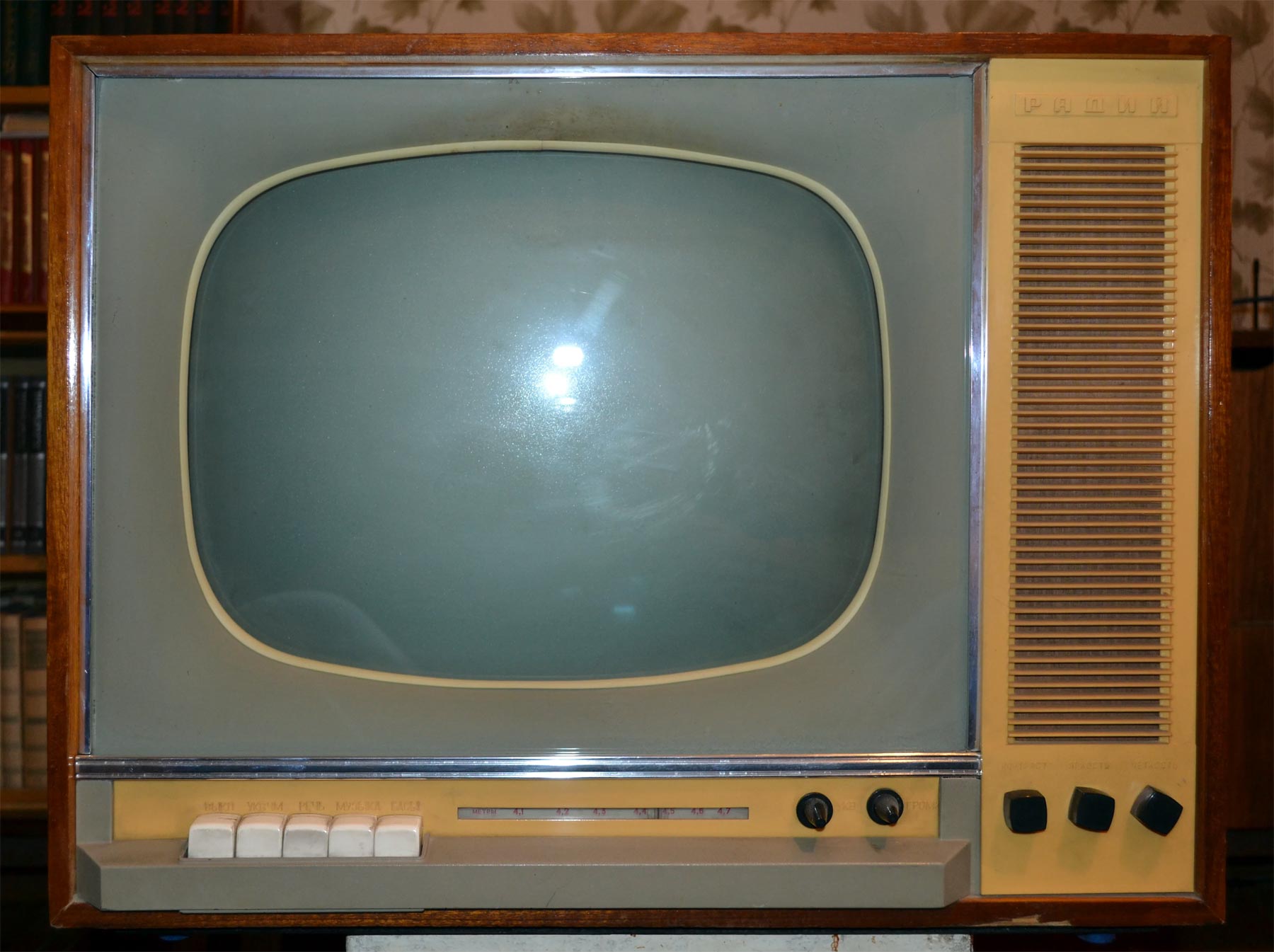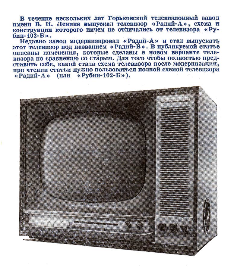 Телевизионный приёмник ч/б изображения *Радий-Б* с 1964 года выпускал Горьковский телевизионный завод имени Ленина. Телевизор **Радий-Б** является модернизированным вариантом предыдущей модели **Радий-А**. В аппарате изменена схема и конструкция шасси. По оформлению он резко отличается от предшественника. Уменьшились размеры футляра до 565х430х360 мм благодаря применению выпуклой алюминиевой задней стенки с отверстиями для вентиляции. Пятиклавишный переключатель режима работы тембр-регистра и для выключения ТВ расположен на левой стороне передней панели а на правой стороне под кинескопом, помещены ручки для настройки блока УКВ-ЧМ и регулятора громкости. Шкала настройки на УКВ-ЧМ радиостанции находится в центре внизу, а регуляторы контрастности, яркости и чёткости в нижней части накладки, под которой расположены громкоговорители. Ручка переключателя каналов перенесена на правую сторону. В телевизоре применён блок ПТК-38, вместо ПТК-74, соответственно изменено крепление. В связи с применением УКВ блока ИП-2 вместо УКВ-И переработана конструкция верньера. С целью уменьшения высоты ТВ, верхнее шасси приближено к нижнему, а для улучшения теплового режима оно сдвинуто назад. В результате верхнее шасси можно выдвинуть или откинуть вверх или вниз не вынимая ТВ из футляра. Это облегчает смену ламп и деталей верхнего шасси. Вырез дна футляра аппарата закрываемый картонным щитком увеличен, что значительно упростило доступ к деталям нижнего шасси. Таким образом осмотр и ремонт ТВ можно производить не разбирая его. Монтаж тоже переработан. Он сделан более надежным и доступным для осмотра и ремонта. Предохранители можно менять не вскрывая задней стенки, а только вынув колодку подключения сети смонтированную на отдельном щитке, который закрывает анодные предохранители когда колодка включена. Технические параметры телевизора аналогичны модели **Рубин-102Б**. Цена телевизора 386 рублей. В октябре 1966 года завод выпустил ещё одну модернизированную модель **Радий-И**, которая впрочем мало отличалась от предыдущей и которая скоро была заменена на новый унифицированный телевизор **Чайка**. Всего телевизоров марки **Радий** всех модификаций за годы выпуска было изготовлено 765.500 штук.