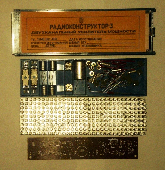 Радиоконструктор-3 (Двухканальный усилитель мощности) выпускался с 1989 года. РК предназначен для сборки двухканального усилителя мощности. Применение интегральных микросхем в усилителе мощности этой категории сложности дает возможность значительно сократить количество комплектующих изделий и габариты конструкции. Технические характеристики собраного усилителя: Диапазон воспроизводимых частот с завалом на краях 2 дБ - 20...20000 Гц. Номинальная выходная мощность при нагрузке 4 Ом и коэффициенте гармоник 1,5% - 2х10 Вт. Максимальная выходная мощность 2х16 Вт. Отношение сигнал/шум не хуже -66 дБ. Переходные затухания между каналами на частоте 1000 Гц -50 дБ. Номинальная чувствительность усилителя при входном сопротивлении 100 кОм около 100 мВ. Стоимость набора 32 рубля.