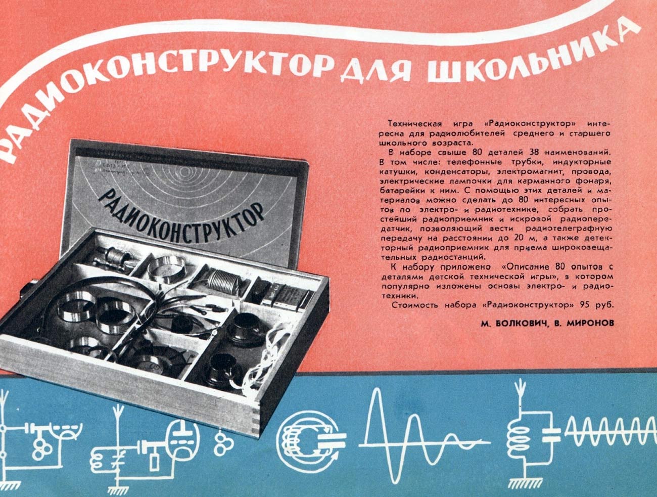 Радиоконструктор для школьника выпускал с 1956 года Ленинградский завод «Радист». Материал из журнала *Новые товары* № 9 за 1957 год.