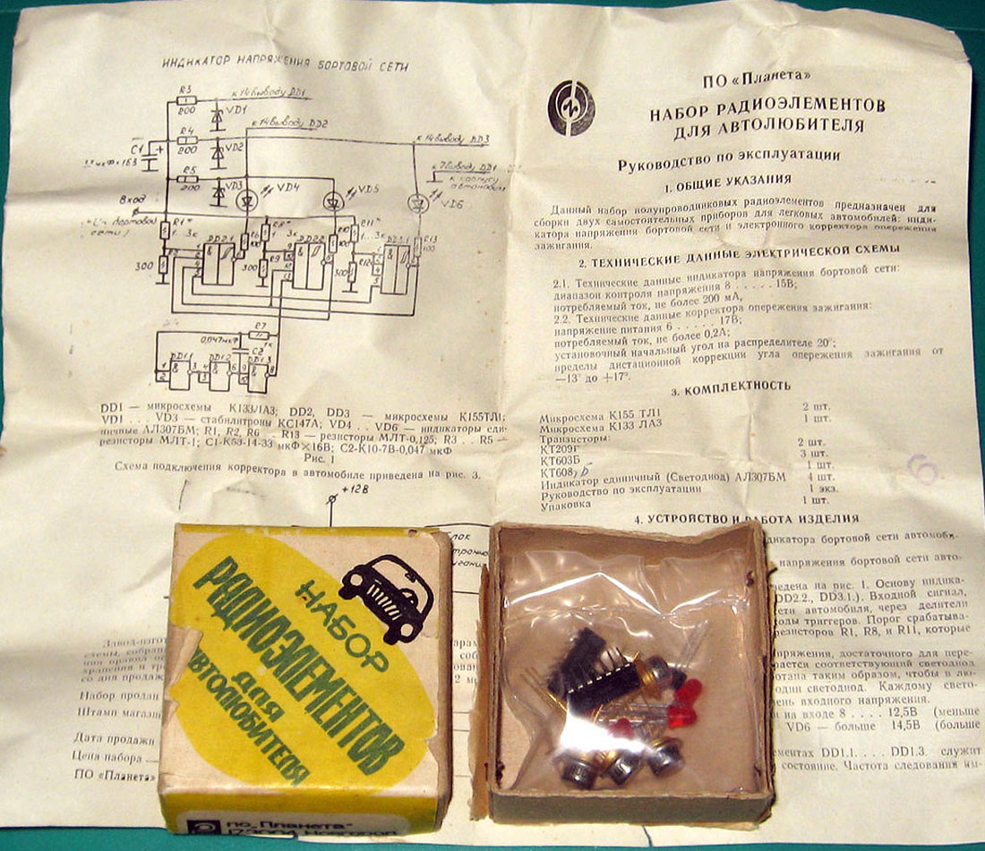 Набор радиоэлементов для автолюбителя выпускался возможно с 1985 года производственным объединением *Планета*. Набор предназначен для сборки двух автономных устройств: индикатора бортовой сети и электронного корректора опережения зажигания для отечественных автомобилей.