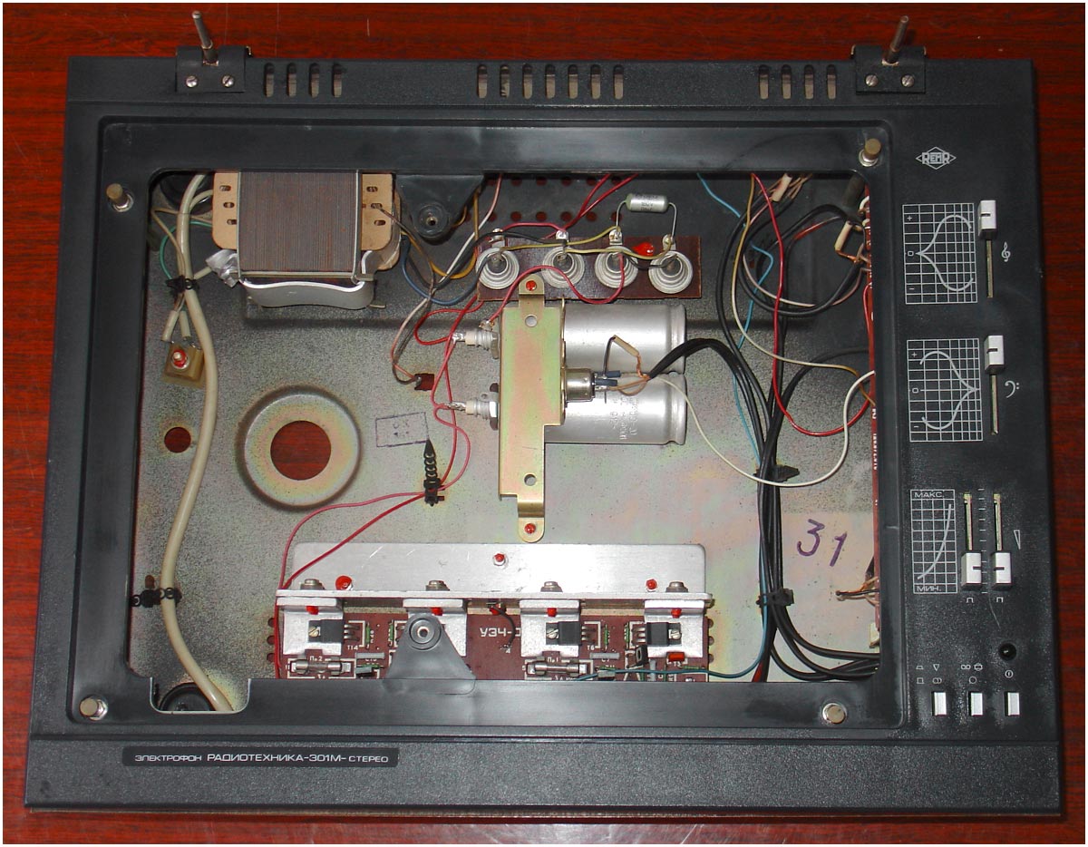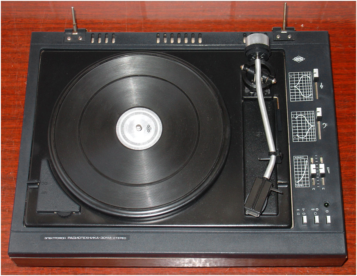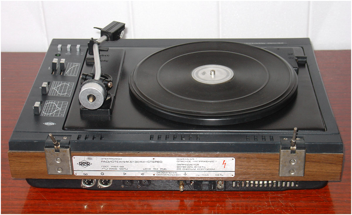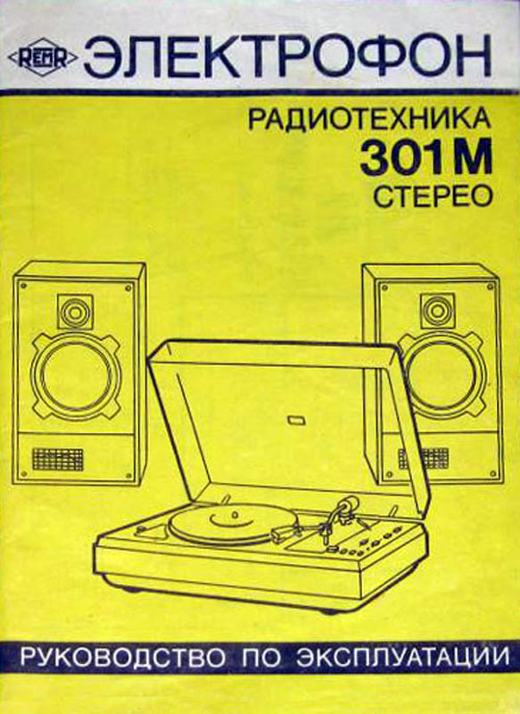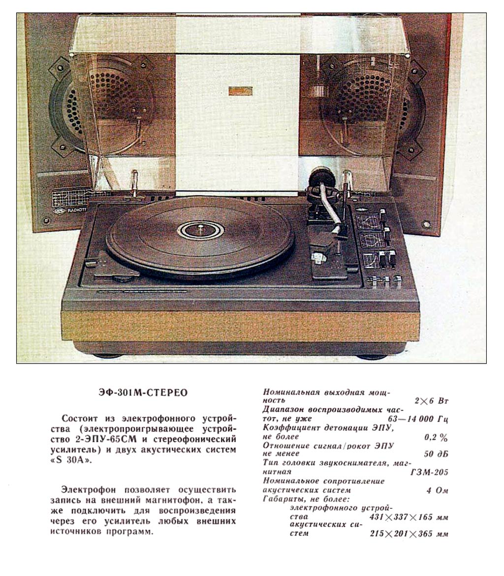 Электрофон *Радиотехника-301-стерео* с 1984 года выпускал Рижский ЭМЗ. ЭФ предназначен для воспроизведения стереофонических записей с грампластинок. В нём установлено III-ЭПУ-62СП. Имеются регуляторы тембра ВЧ, НЧ, громкости, баланса. Диапазон рабочих частот 80...12500 Гц. Номинальная выходная мощность 2х6 Вт. Потребляемая мощность 50 Вт. Габариты ЭФ 430х355х160 мм. Габариты АС 215х365х185 мм. Вес 21 и 8 кг. С 1986 года завод выпускал электрофон **Радиотехника-301М-стерео** по оформлению, конструкции и схеме, кроме нового двухскоростного 2-ЭПУ-65СМ и расширенных воспроизводимых частот до 63...14000 Гц, аналогичный описанному.