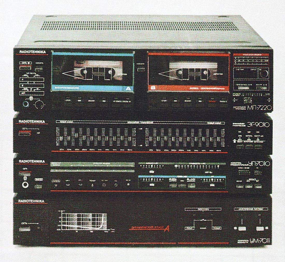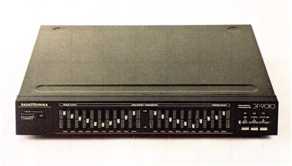 Эквалайзер *Радиотехника ЭГ-9010-стерео* подготовлен к выпуску с 1987 года Рижским ПО *Радиотехника*. Предназначен для коррекции амплитудно-частотной характеристики бытовой стереофонической радиоаппаратуры, а также для коррекции фонограмм при записи на магнитофон. Основные технические характеристики: Частоты регулировки (на каждый канал) - 32, 63, 125, 250, 500, 1000, 2000, 4000, 8000, 16000 Гц. Диапазон воспроизводимых частот - 20...20000 Гц. КНИ - 0,02%. Уровень фона - минус 95 дБ. Потребляемая мощность - 8 Вт. Габаритные размеры - 430 х 71 х 352 мм. Масса - 6 кг. Эквалайзер мог комплектовать музыкальные стерео-комплексы *Радиотехника*, составленные из блочной продукции ПО *Радиотехника*.