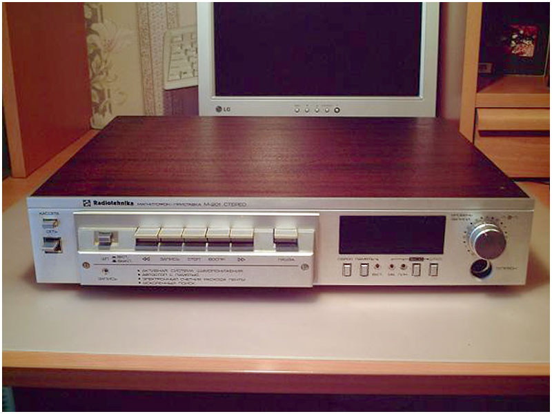 Магнитофон-приставку *Радиотехника М-201С* с начала 1983 года выпускало Рижское ПО *Радиотехника*. МП предназначен для работы в составе радиокомплекса **Радиотехника-101-стерео**, но может использоваться и отдельно. Магнитофон рассчитан на запись фонограмм на ленты А4205-3Б или А4212-3Б в кассетах МК-60 или МК-90, с микрофона, электрофона, телевизора, радиоприёмника, тюнера, проигрывателя, другого магнитофона и с радиолинии как непосредственно и через УКУ. Воспроизведение осуществляется на внешний УЗЧ и стереофонические телефоны. Магнитофон имеет переключатели входов и типа ленты, люминесцентный индикатор уровня сигнала при записи или воспроизведении, счётчик расхода ленты, поиск фонограмм по счетчику и нулевому сбросу. Краткие технические характеристики: Отклонение скорости от номинальной 1,5%. Коэффициент детонации ±0,15%. Диапазон частот звука на ленте: Сг - 40...14000 Гц, ленты Fe 40...12500 Гц Уровень помех и шумов при включенной СШП -60 дБ. Относительный уровень стирания -65 дБ. Напряжение на ЛВ 400...600 мВ. Потребляемая мощность 15 Вт. Габариты МП 430х92х360. Его масса 8 кг.