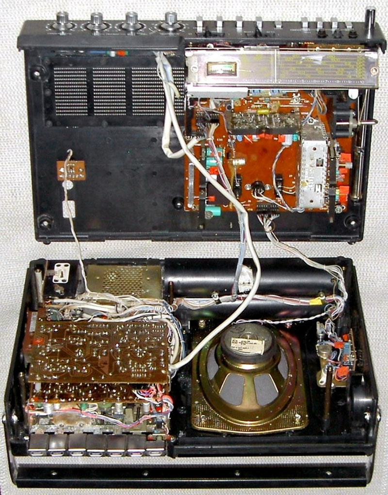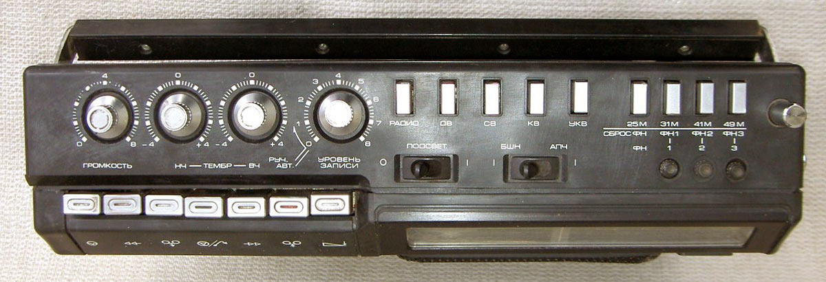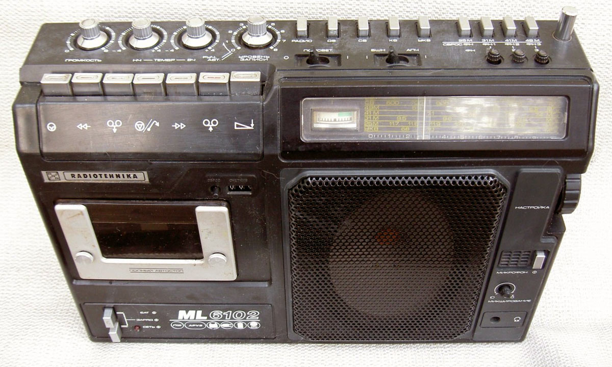 Портативная кассетная магнитола *Радиотехника МЛ-6102* выпускалась с 1988 года Рижским радиозаводом имени А.С.Попова. Магнитола состоит из приёмника первой группы сложности работающего в диапазонах ДВ, СВ, КВ, УКВ и кассетной магнитофонной панели третьей группы сложности. Предназначена для приёма радиостанций и для записи фонограмм с приёмника, микрофона и внешних источников, с последующим воспроизведением. Есть возможность включения одной из трёх фиксированных станций в диапазонах УКВ, СВ, ДВ. В модели имеются: автоматическая подстройка частоты и система бесшумной настройки в диапазоне УКВ, подсветка шкалы, автоматическое выключение магнитофона по окончании ленты, счётчик расхода ленты, ограничитель шума, система наложения записи, АРУЗ, возможность отстройки от помех ГС, подзаряд батарей, регулировки тембра ВЧ и НЧ, электретный микрофон. Чувствительность приёмника в диапазонах: ДВ 2,0 мВ/м, СВ 1,5 мВ/м, KB 0,35 мВ/м, УКВ 10 мкВ. Селективность в диапазонах ДВ, СВ - 30 дБ. Диапазон воспроизводимых частот по звуковому давлению в АМ тракте 125...3350 Гц, ЧМ и магнитной записи 125...12500 Гц. Питание: сеть или от батареи из 6 элементов 373. Габариты модели 386х280x120 мм, вес 5,5 кг.