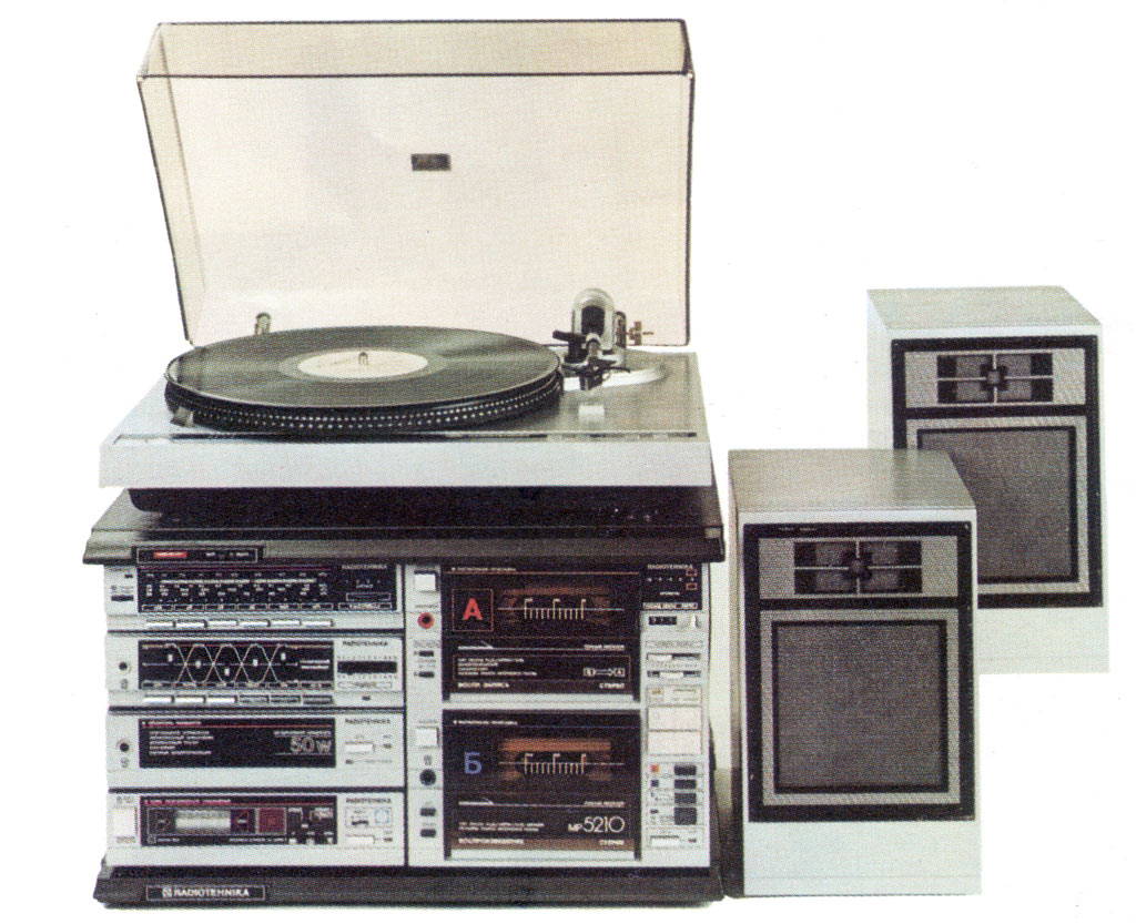 Магниторадиола *Радиотехника МР-5210-стерео* с 1987 года выпускалась Рижским радиозаводом имени Попова. Магниторадиола состоит из отдельных блоков: тюнера, двухкассетной магнитофонной приставки, усилителя мощности, предварительного усилителя с 5-ти полосным эквалайзером, ЭПУ, таймера и выносных АС. В блок тюнера имеется; индикатор настройки, индикатор стереопередачи, точная настройка в диапазоне КВ, отключаемые БШН и АПЧ в диапазоне УКВ. Блок магнитофона; система шумопонижения, работа с двумя типами магнитной ленты, автопоиск программ по паузе, синхронный старт перезаписи, индикатор уровня записи и воспроизведения, счётчик расхода ленты. В блок таймера есть; управление временем включение и выключение в режимах радиоприёма, магнитной записи и воспроизведения, режим будильник с подачей звукового сигнала, индикация текущего времени. Блок усилителя мощности; индикаторы перегрузки. ЭП типа **ЭП-102** АРИЯ с прямым приводом, головкой ГЗМ-155 и регулятором частоты вращения диска. Блок предварительного усилителя с 5-ти полосным регулятором тембра. Блоки монтируются на специальной стойке с подсветкой. Диапазоны волн: ДВ, СВ, КВ (обзорный), УКВ. Номинальная выходная мощность: 2х10 Вт. Чувствительность в диапазонах: ДВ, СВ, КВ 150 мкВ, в диапазоне УКВ 5 мкВ. Диапазон частот в диапазоне УКВ 63...12500 Гц, ДВ, СВ и КВ 63...4000 Гц, при воспроизведении грамзаписи 40...18000 Гц, магнитной записи 40...14000 Гц. Потребляемая мощность 50 Вт. Тип АС **S-25**. Габариты любого из блоков - 460х420х350 мм, габариты одной АС - 215х370х200 мм. Масса МР 30, АС 5 кг.