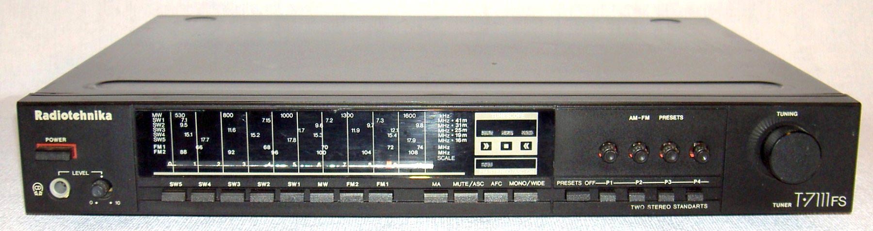 Тюнер *Радиотехника Т-7111FS* выпускался для экспорта с 1989 года Рижским ПО *Радиотехника*. Создан на основе тюнера *Радиотехника Т-7111С* и предназначен для высококачественного приема моно и стереофонических радиовещательных программ с ЧМ в диаппазоне УКВ в двух стандартах стереовещания (полярная модуляция и пилот-тон) и радиовещательных программ в диапазонах СВ и КВ. Тюнер обеспечивает: возможность подключения УЗЧ,магнитофона и головных стереотелефонов, внешних антенн и магнитной антенны для диапазонов ДВ, СВ и КВ, ориентации магнитной антенны без изменения положения тюнера, регулировки громкости звучания стереотелефонов, фиксированную настройку в любом диапазоне, автоматическую подстройку частоты на всех диапазонах, отключаемую вручную, а также отключаемую автоматически при вращении ручки настройки в диапазоне УКВ. Тюнер имеет: индикацию точной настройки, режима стерео, автоматическое переключение режимов стерео - моно, режим широкая полоса, Бесшумную настройку в диапазоне УКВ, автоматическую регулировку чувствительности в диапазонах ДВ, СВ и КВ, индикацию перегрузки антенного входа при приёме сигналов в диапазонах ДВ,СВ и КВ. Основные технические характеристики: Диапазон принимаемых частот СВ - 0,525-1,607 МГц. КВ-1 - 7,1-7,35 МГц. КВ-2 - 9,5-9,9 МГц. КВ-3 - 11,55-12,1 МГц. КВ-4 - 15,1-15,45 МГц. КВ-5 - 17,7-17,9 МГц. УКВ-1 - 65.8-74 МГЦ. УКВ-2 87.5-108 МГц. Чувствительность с внешней антенны в диапазоне УКВ - 3 мкВ, СВ, КВ - 100 мкВ, с магнитной антенны - в диапазоне СВ - 1,5 мВ/м, КВ - 1 мВ/м. Избирательность по соседнему каналу при расстройке 9 кГц в диапазонах СВ, КВ не менее 40 дБ. Напряжение на выходе для подключения стереотелефонов при номинальном сопротивлении нагрузки 16 Ом - 150 мВ. Потребляемая мощность 8 Вт. Габаритные размеры 430x360x72 мм. Масса без упакрвки 5 кг.