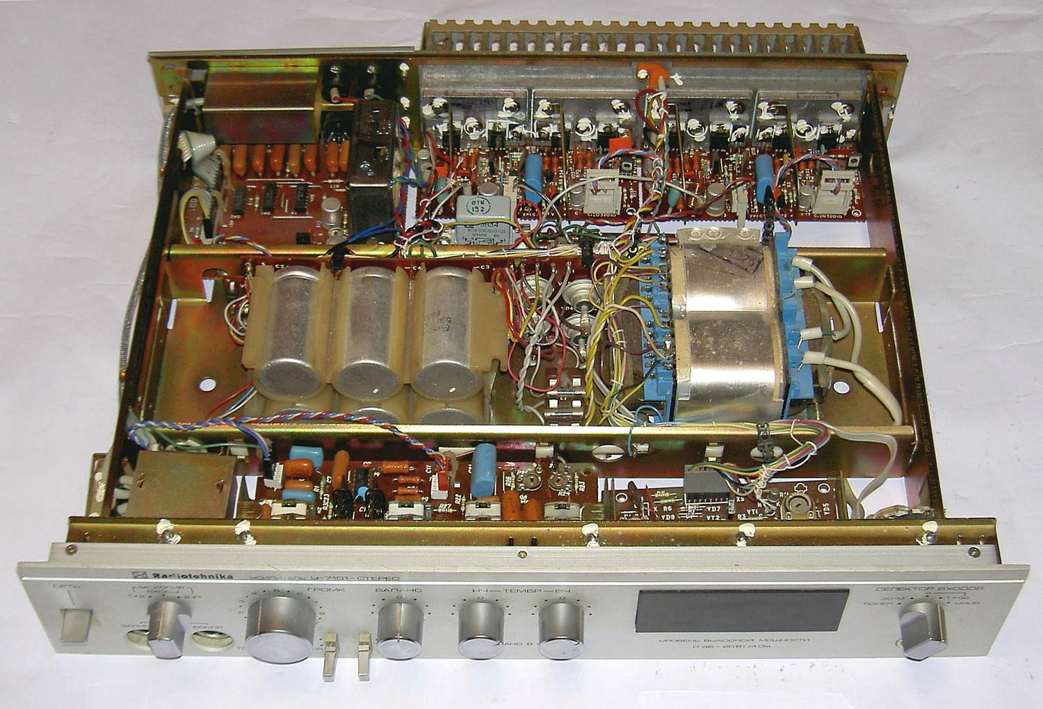 Полный усилитель звуковой частоты *Радиотехника У-7101С* с 1988 года выпускало Рижское ПО *Радиотехника*. Усилитель практически не отличается от предыдущего серийного усилителя ЗЧ **Радиотехника У-101С**. Он предназначен для высококачественного усиления моно и стереофонических сигналов от различных источников. Номинальная выходная мощность - 2х20 Вт. Коэффициент гармоник 0,3%. Диапазон воспроизводимых частот - 20...20000 Гц. Потребляемая мощность - 80 Вт. Габаритные размеры усилителя - 430х375x90 мм. Его масса 9 кг.