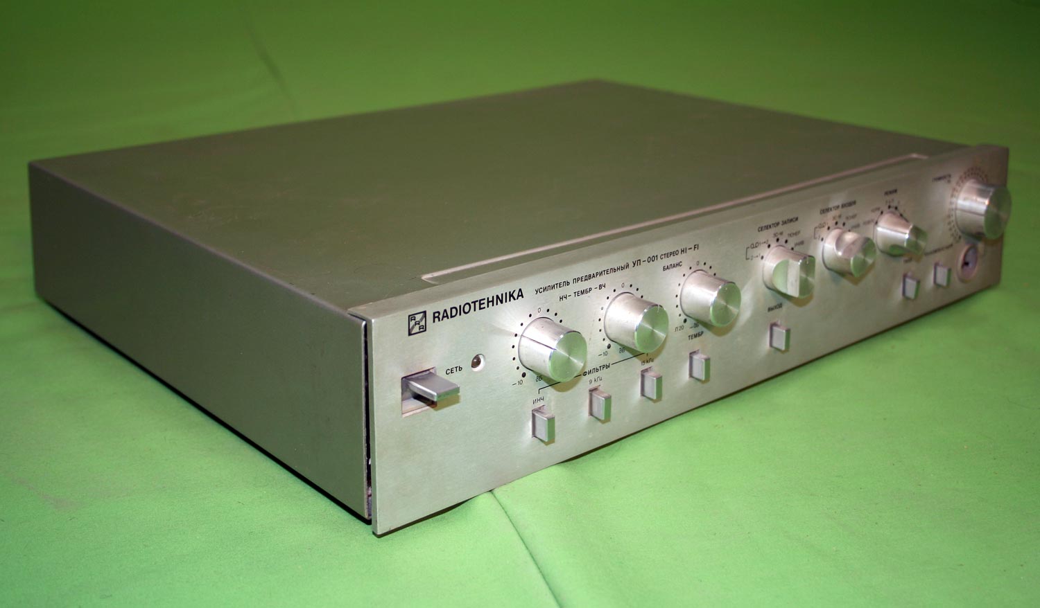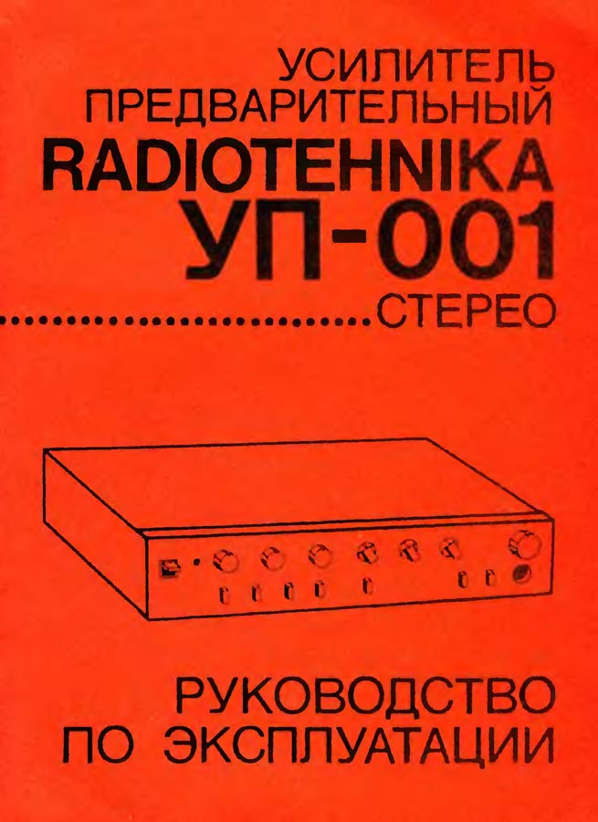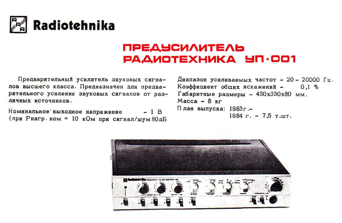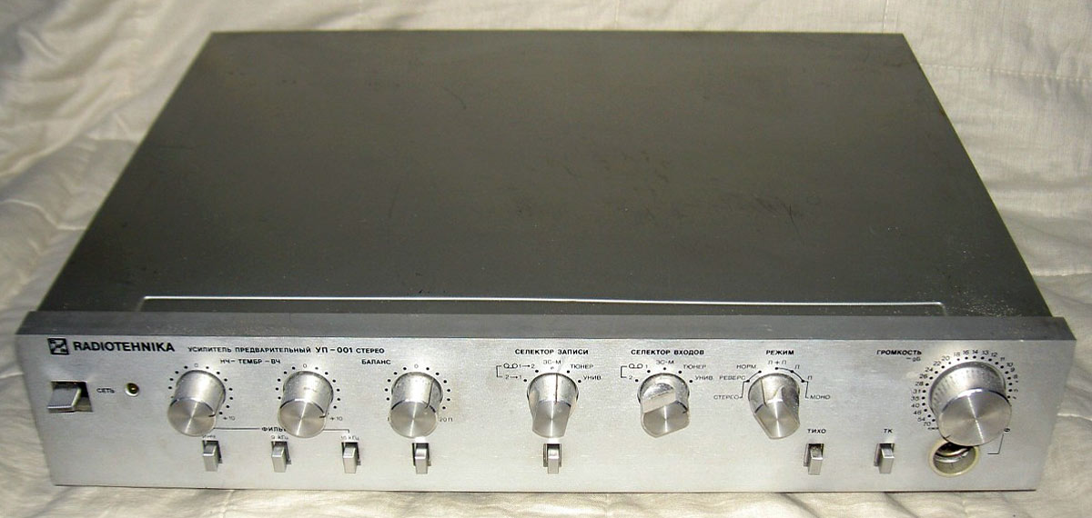 Стереофонический предварительный усилитель *Радиотехника УП-001-стерео* с 1985 года выпускал Рижский радиозавод имени А.С. Попова. ПУ рассчитан на работу в составе комплекса. Он обеспечивает выбор источника сигнала, с обработкой и усилением для прослушивания и источника для записи на два магнитофона, перезапись с первого магнитофона на второй и наоборот, контроль записываемого сигнала. В усилителе имеется плавная и ступенчатая регулировка громкости с отключаемой тонкомпенсацией, раздельная регулировка тембра и стереобаланса. Номинальное выходное напряжение, при номинальном сопротивлении нагрузки 10 кОм - 1 В. Номинальный диапазон частот - 20...20000 Гц при неравномерности АЧХ ±0,3 дБ. Коэффициент гармоник - 0,03%. Потребляемая усилителем мощность 15 Вт. Габариты аппарата - 430 х 358 х 88 мм. Масса - 7,2 кг.