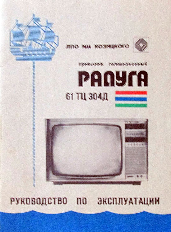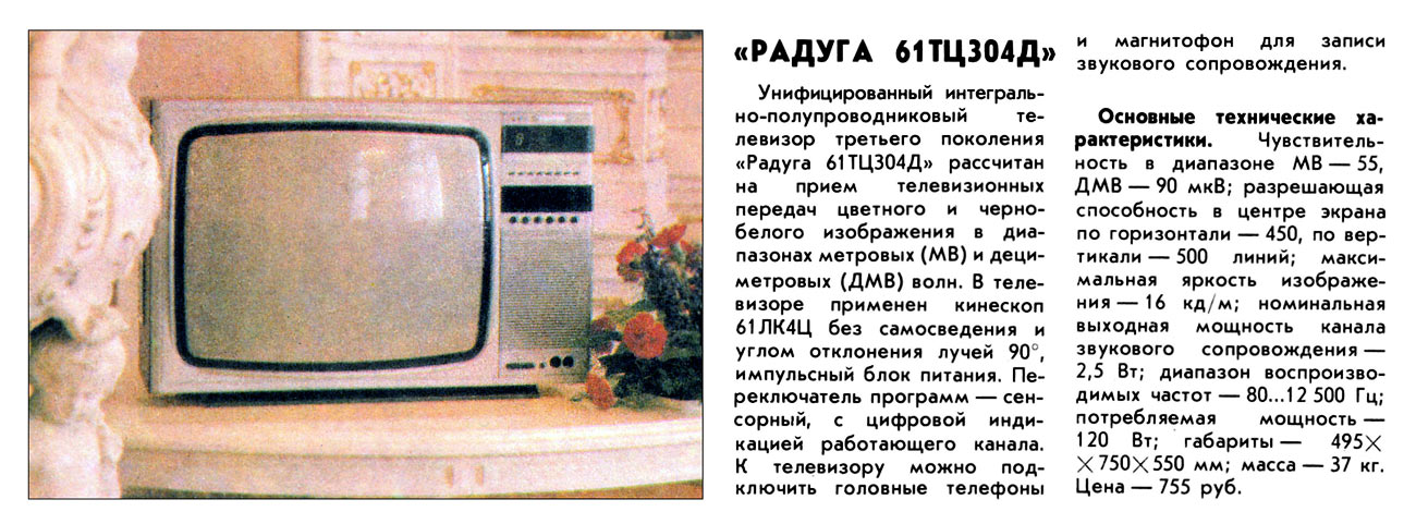 Телевизионный приёмник цветного телевидения *Радуга 61ТЦ-304Д* с 1988 года выпускало Ленинградское ПО им. Козицкого. Унифицированный интегрально полупроводниковый телевизор второго класса, третьего поколения **Радуга-61ТЦ-304Д** рассчитан на приём цветного и чёрно-белого изображения в диапазонах MB и ДМВ. В нём применён кинескоп типа 61ЛК4Ц без самосведения и углом отклонения лучей 90°, импульсный блок питания. Переключатель программ ТВ сенсорный с цифровой индикацией рабочего канала. К телевизору можно подключить головные телефоны, бытовой магнитофон или видеомагнитофон. Чувствительность в диапазоне MB - 55, ДМВ - 90 мкВ. Чёткость в центре экрана по горизонтали 450, по вертикали 500 линий. Максимальная яркость изображения 16 кд/м. Номинальная выходная мощность канала звука - 2,5 Вт. Диапазон рабочих частот звука 80...12500 Гц. Потребляемая от сети мощность 120 Вт. Габариты телевизора 495х750х550 мм. Масса 37 кг. Цена модели 755 рублей.