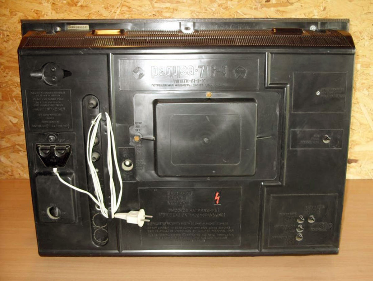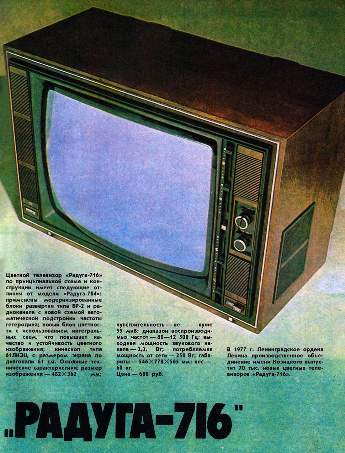 Телевизионный приёмник цветного изображения *Радуга-716/Д* с 1977 года выпускал Ленинградский завод им. Козицкого. Унифицированный цветной телевизор второго класса **Радуга-716/Д** выпускался в настольном оформлении с вариантами отделки корпуса и передней панели. В телевизоре применён кинескоп 61ЛК3Ц, использованы радиолампы, транзисторы, интегральные микросхемы. Чувствительность модели в МВ диапазоне 55 мкВ, в ДМВ (Д*) 100 мкВ. Номинальная выходная мощность 2,3 Вт. Диапазон воспроизводимых звуковых частот - 80...12500 Гц. Потребляемая от сети мощность 250 Вт. Габариты телевизора - 550х785х580 мм. Масса 60 кг. Цена модели - 680 и 705 рублей с индексом *Д*.