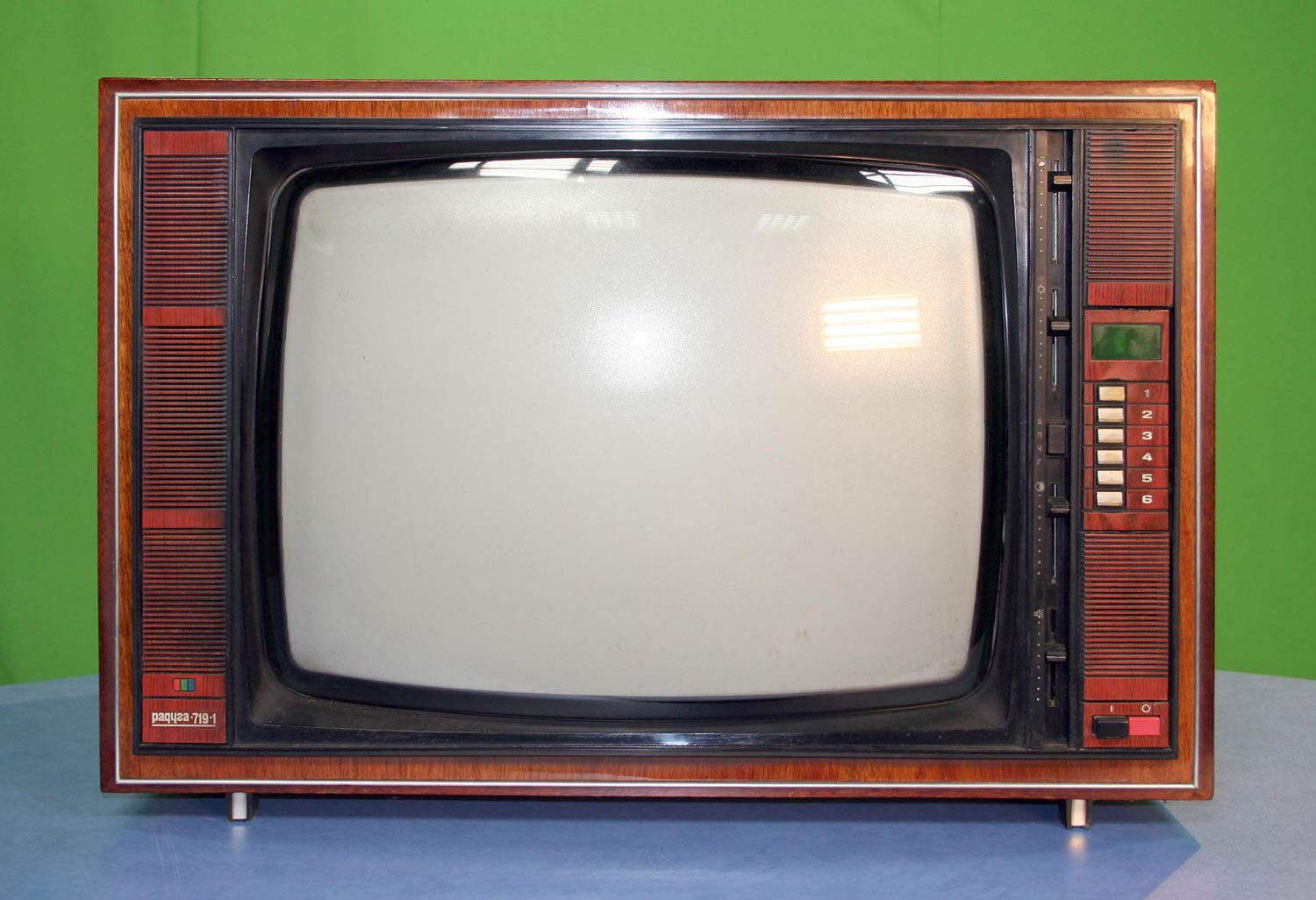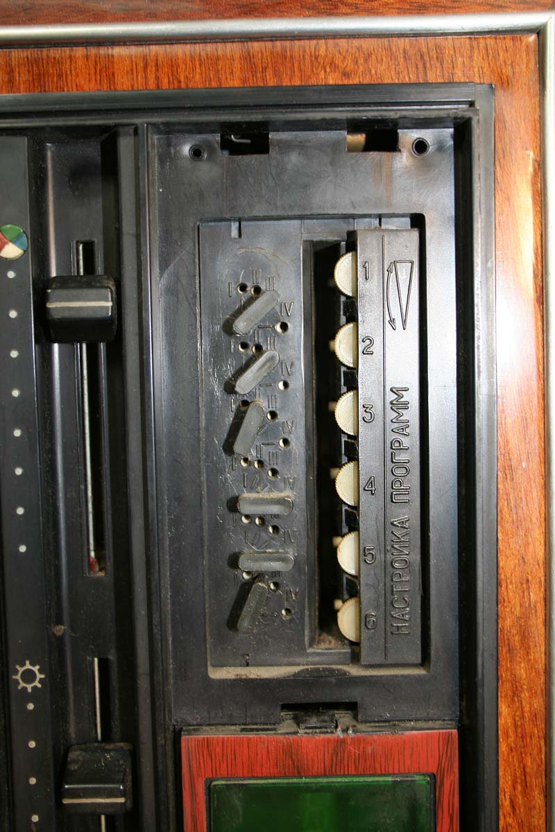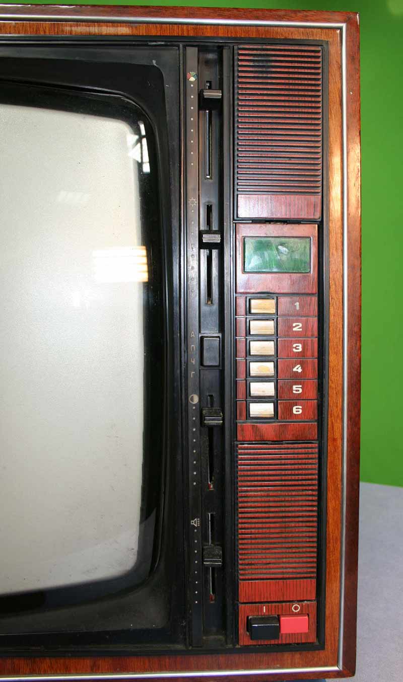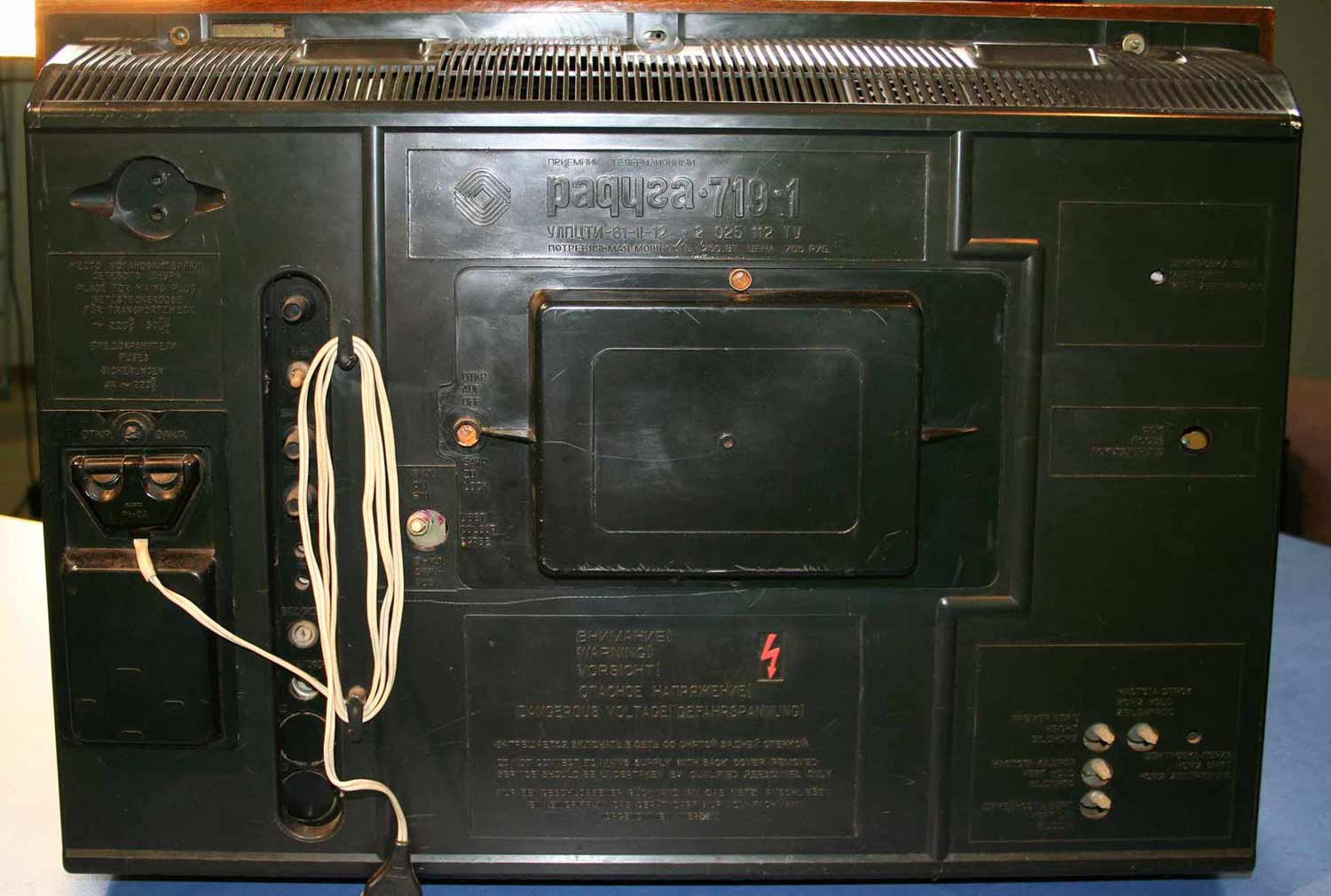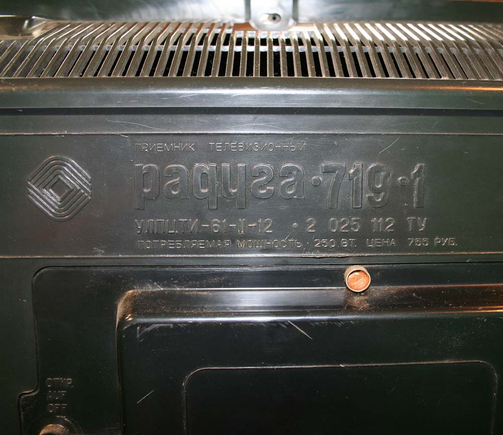 Телевизионный приёмник цветного изображения *Радуга-719* с 1978 года выпускал Ленинградский завод имени Козицкого. Унифицированный лампово-полупроводниковый цветной телевизионный приемник 2-го класса **Радуга-719** (УЛПЦТИ-61-II-12) предназначен для приёма программ цветного и ч/б изображения в МВ и ДМВ диапазонах (при установке блока ДМВ). Аппарат выпускался в настольном оформлении, с различными вариантами отделки. В телевизоре применён взрывозащищенный кинескоп 61ЛК3Ц или 61ЛК4Ц. Включение нужной программы производится посредством легкого нажима на соответствующую клавишу. Переключение происходит с помощью электронного устройства, а номер программы показывает цифровой индикатор, если предварительно сделан выбор нужного поддиапазона и отрегулировано положение потенциометра настройки. В телевизоре есть возможность: подключения магнитофона для записи звукового сопровождения; его прослушивание на головные телефоны при отключенной АС. Высокая чувствительность в сочетании с АРУ позволяет вести приём на удалении от телевизионного центра. АПЧГ повышает качество изображения и сохраняет его при переключении на другой канал. Регуляторы на передней панели позволяют изменять громкость, яркость, контрастность изображения, насыщенность. Для повышения качества приёма чёрно-белого изображения в схему введено автоматическое отключение режекторных фильтров. Уменьшение влияния помех достигается системой АПЧ и Ф. Схема ТВ предусматривает автоматическое поддержание размеров изображения при колебании напряжения сети в пределах 200...230 В и автоматическое размагничивание кинескопа при включении. Размер изображения 480x360 мм. Чувствительность в МВ 55 мкВ, ДМВ 90 мкВ. Разрешающая способность в центре 450 линий. Выходная мощность 2,3 Вт. Диапазон воспроизводимых частот 80...12500 Гц. Потребляемая мощность 250 Вт. Габариты телевизора 550x785x548 мм. Масса - 60 кг. Первые телевизоры *Радуга-719*, которые планировали выпускать с 1977 года для расширения ассортимента наименований имели вид модели *Радуга-716*, смотрите 1-е фото в галерее. Но потом оставили эту затею и с 1978 года начали полноценный, но ограниченный выпуск усовершенствованной модели *Радуга-719*, смотрите 2-е фото в галерее. С 1982 года массово выпускался телевизор *Радуга-719-1* - по унификации и оформлении практически аналогичный описанному, но с возможностью приёма программ в диапазоне ДМВ.