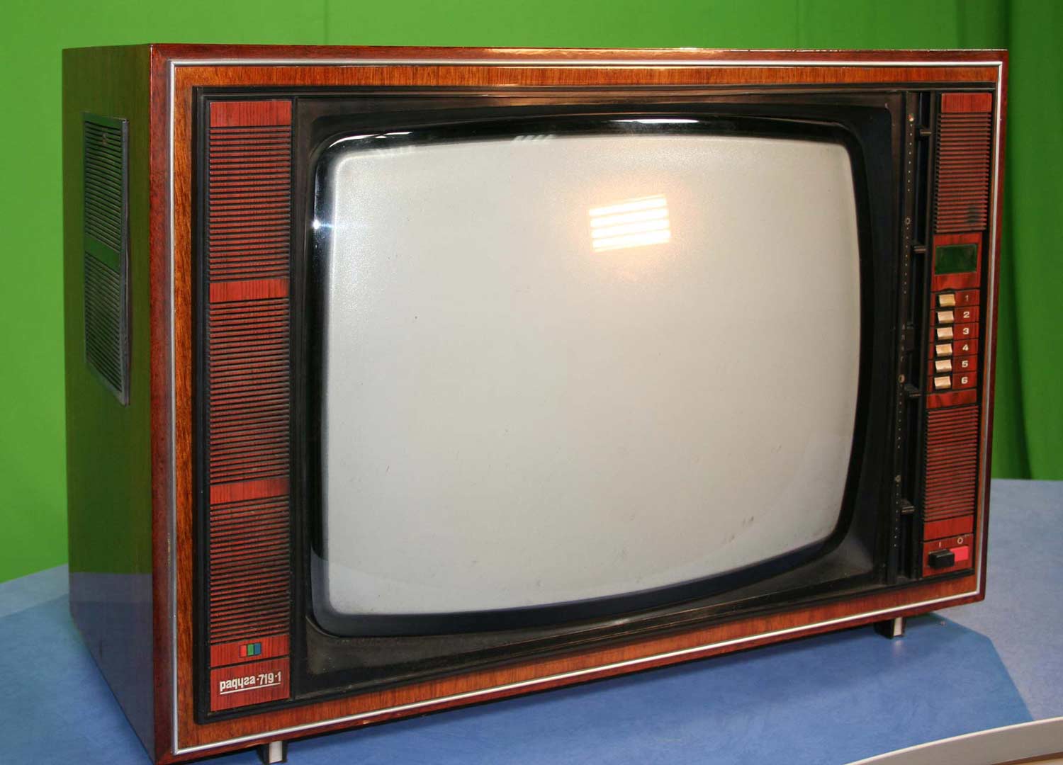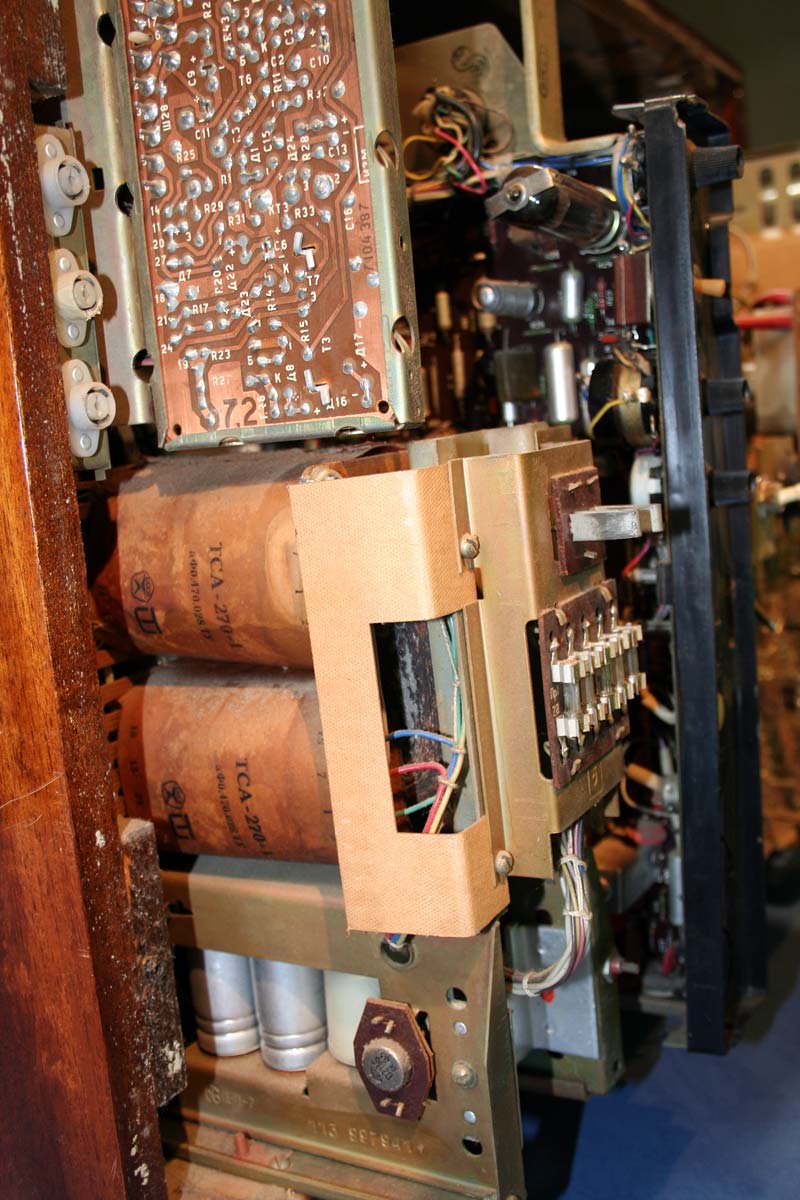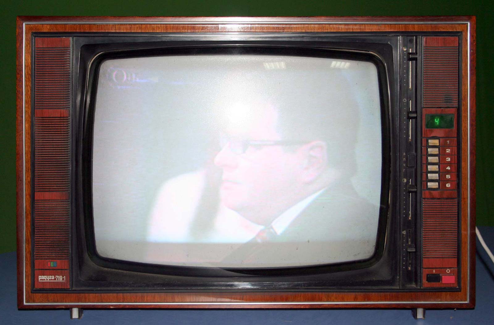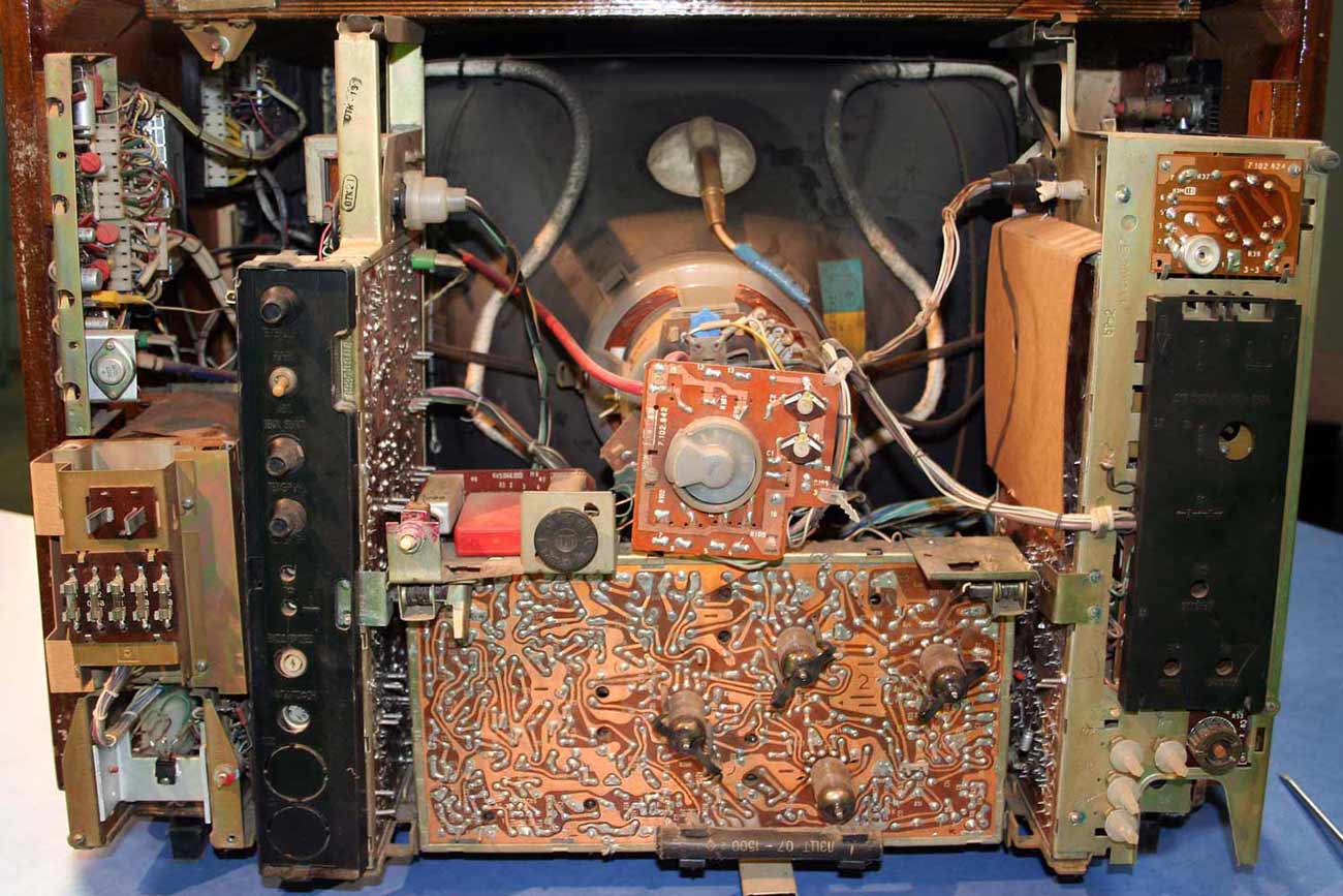 Телевизионный приёмник цветного изображения *Радуга-719* с 1978 года выпускал Ленинградский завод имени Козицкого. Унифицированный лампово-полупроводниковый цветной телевизионный приемник 2-го класса **Радуга-719** (УЛПЦТИ-61-II-12) предназначен для приёма программ цветного и ч/б изображения в МВ и ДМВ диапазонах (при установке блока ДМВ). Аппарат выпускался в настольном оформлении, с различными вариантами отделки. В телевизоре применён взрывозащищенный кинескоп 61ЛК3Ц или 61ЛК4Ц. Включение нужной программы производится посредством легкого нажима на соответствующую клавишу. Переключение происходит с помощью электронного устройства, а номер программы показывает цифровой индикатор, если предварительно сделан выбор нужного поддиапазона и отрегулировано положение потенциометра настройки. В телевизоре есть возможность: подключения магнитофона для записи звукового сопровождения; его прослушивание на головные телефоны при отключенной АС. Высокая чувствительность в сочетании с АРУ позволяет вести приём на удалении от телевизионного центра. АПЧГ повышает качество изображения и сохраняет его при переключении на другой канал. Регуляторы на передней панели позволяют изменять громкость, яркость, контрастность изображения, насыщенность. Для повышения качества приёма чёрно-белого изображения в схему введено автоматическое отключение режекторных фильтров. Уменьшение влияния помех достигается системой АПЧ и Ф. Схема ТВ предусматривает автоматическое поддержание размеров изображения при колебании напряжения сети в пределах 200...230 В и автоматическое размагничивание кинескопа при включении. Размер изображения 480x360 мм. Чувствительность в МВ 55 мкВ, ДМВ 90 мкВ. Разрешающая способность в центре 450 линий. Выходная мощность 2,3 Вт. Диапазон воспроизводимых частот 80...12500 Гц. Потребляемая мощность 250 Вт. Габариты телевизора 550x785x548 мм. Масса - 60 кг. Первые телевизоры *Радуга-719*, которые планировали выпускать с 1977 года для расширения ассортимента наименований имели вид модели *Радуга-716*, смотрите 1-е фото в галерее. Но потом оставили эту затею и с 1978 года начали полноценный, но ограниченный выпуск усовершенствованной модели *Радуга-719*, смотрите 2-е фото в галерее. С 1982 года массово выпускался телевизор *Радуга-719-1* - по унификации и оформлении практически аналогичный описанному, но с возможностью приёма программ в диапазоне ДМВ.