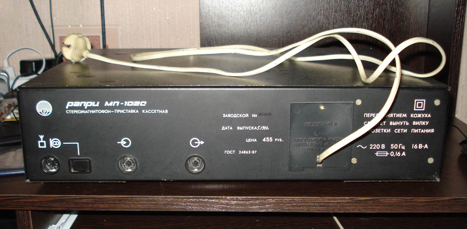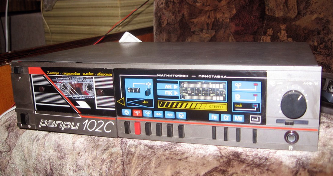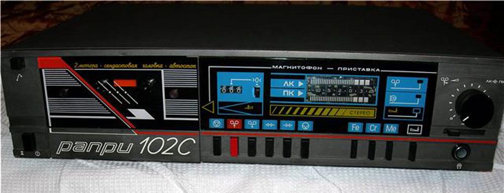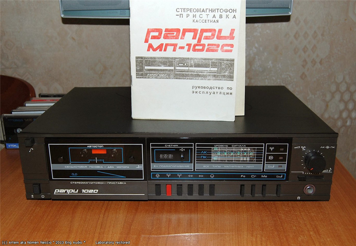 Кассетный магнитофон-приставка *Рапри-202С* с начала 1987 года выпускалась Московским заводом *Радиоприбор*. МП обеспечивает запись звуковых фонограмм на магнитную ленту и воспроизведение их через внешний усилитель с АС. В МП *Рапри-202С* установлена сендастовая магнитная головка, система ШП компандерного типа, электролюминесцентная индикация уровня записи и воспроизведения, регулировка тока подмагничивания. Имеется функция поиска по фрагментам фонограмм. Основные технические характеристики МП: Скорость ленты - 4,76 см/с; коэффициент детонации ±0,15 %; относительный уровень шумов и помех -60 дБ; диапазон рабочих частот на линейном выходе 30...16000 Гц; потребляемая мощность 20 Вт; наружные размеры модели 430х350х115 мм; её масса 7 кг. Розничная цена 400 рублей. С осени 1987 года МП именовалась как *Рапри МП-202С*, а в начале 1988 года модель начала выпускаться под наименованием *Рапри МП-102С*, вызвано это было тем, что параметры МП соответствовали 1 классу сложности. Модель полностью аналогична описанной выше, изменилось лишь наименование и цена, которая теперь была 455 рублей. Магнитофон-приставку *Рапри МП-102С* выпускали в нескольких вариантах цветового оформления.