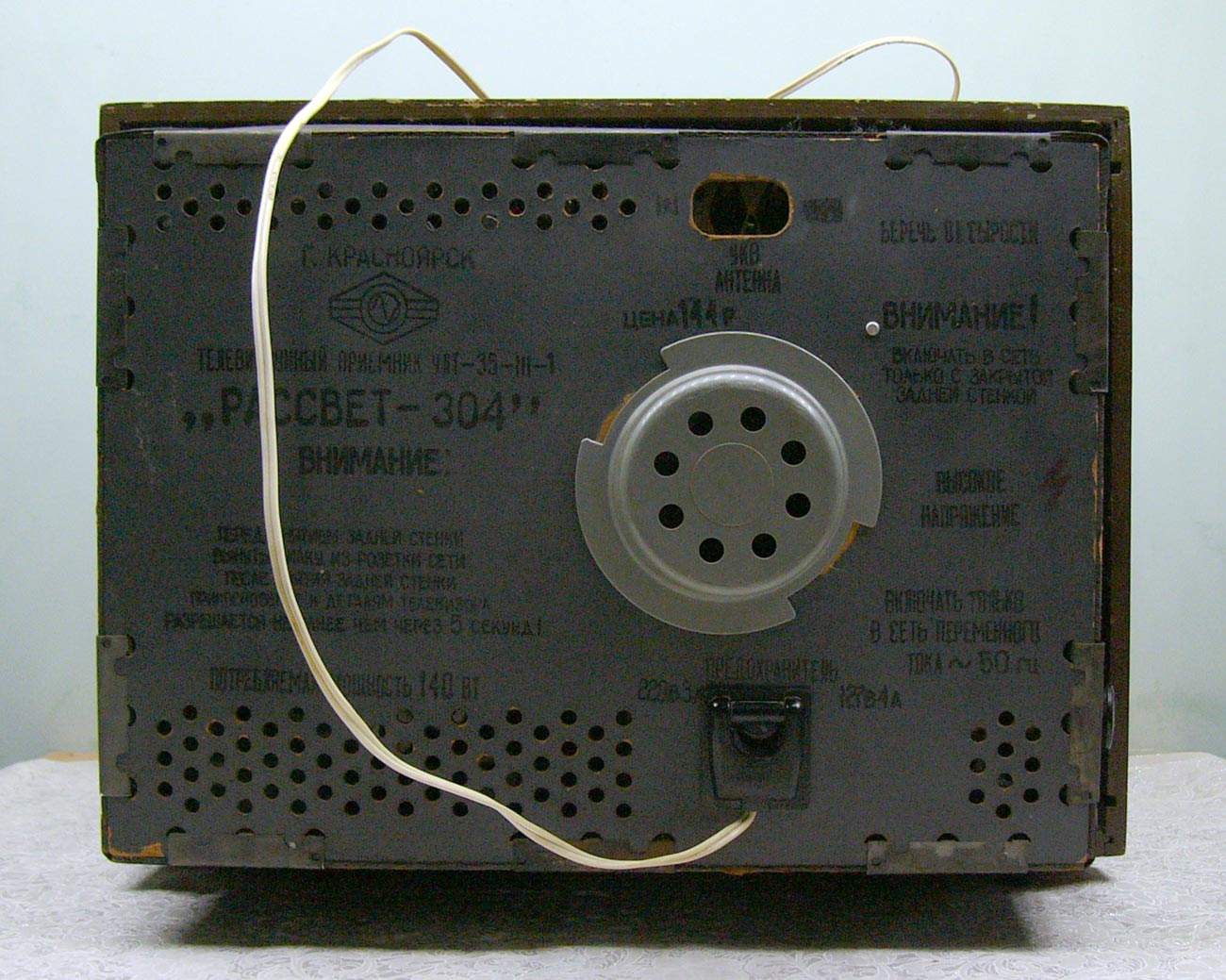 Телевизионный приёмник чёрно-белого изображения *Рассвет-304* с осени 1971 года выпускал Красноярский завод телевизоров. **Рассвет-304** (УЛТ-35-III-1) - унифицированный телевизор III класса, выпускавшийся в настольном оформлении с различными вариантами отделки корпуса и передней панели. В телевизоре применен кинескоп 35ЛК6Б, с размером экрана по диагонали 35 см и углом отклонения электронного луча 70°. Телевизор обеспечивает приём телепередач на любом из 12-ти каналов в зоне приёма телевизионного центра или ретрансляционной станции. Есть возможность подключения магнитофона для записи звукового сопровождения или прослушивание звукового сопровождения на головные телефоны; установки панели для подключения ПДС. АРУ обеспечивает устойчивое изображение. Действие помех минимально с системой АПЧ и Ф строчной развёртки. Основные параметры: Размер изображения 224х292 мм. Чувствительность ТВ - 200 мкВ. Разрешающая способность 350...450 линий. Выходная мощность звукового канала 0,5 Вт. Телевизор питается от сети переменного тока напряжением 110, 127, 220 или 237 В. Потребляемая мощность 150 Вт. Габариты телевизора 379 x 494 х 438 мм. Вес 25 кг. Всего было выпущено около 2,5 миллиона телевизоров.