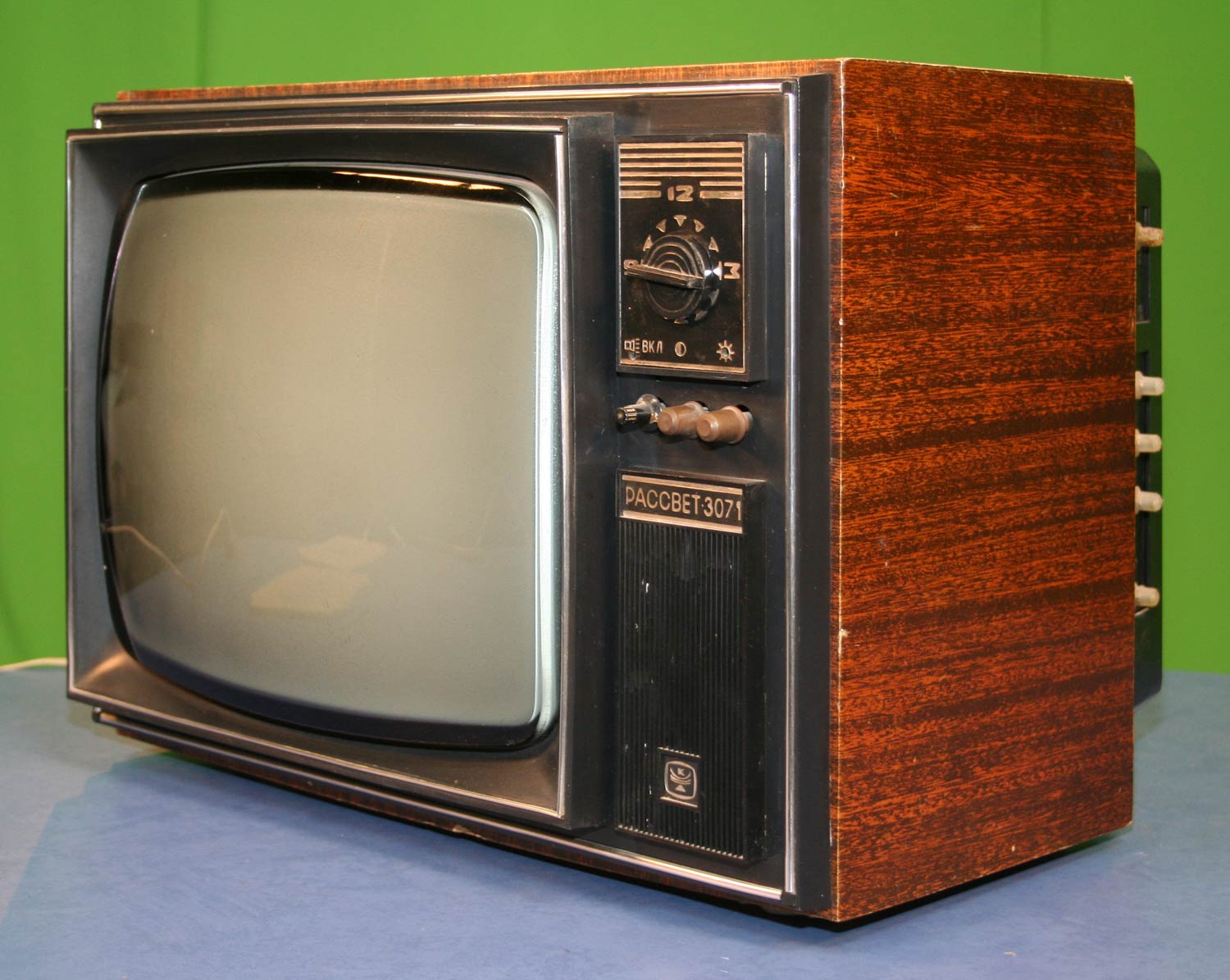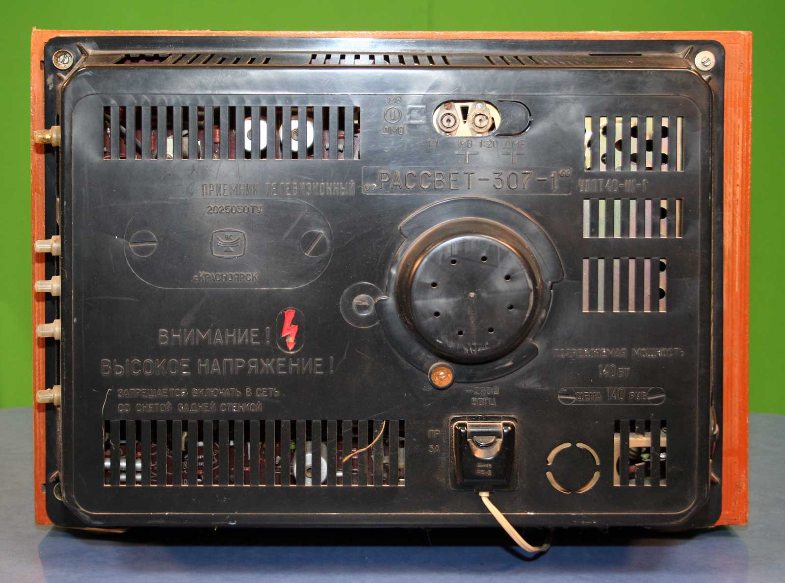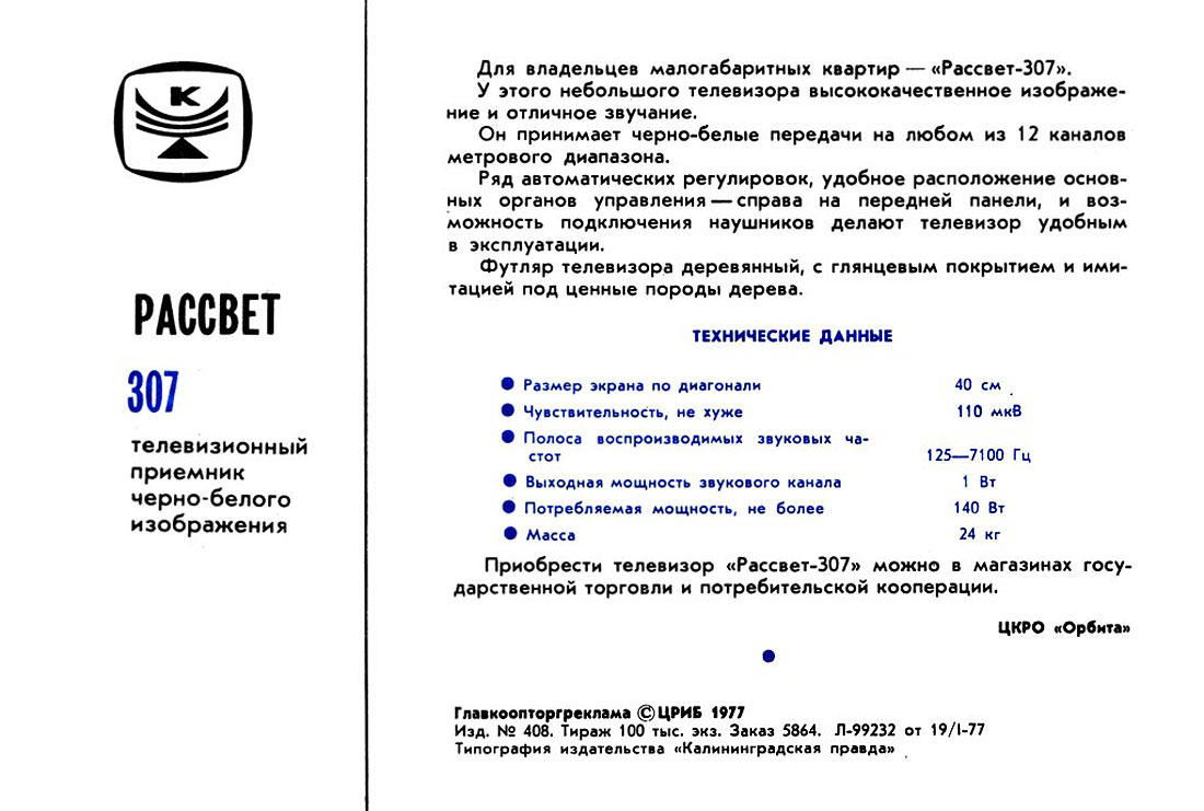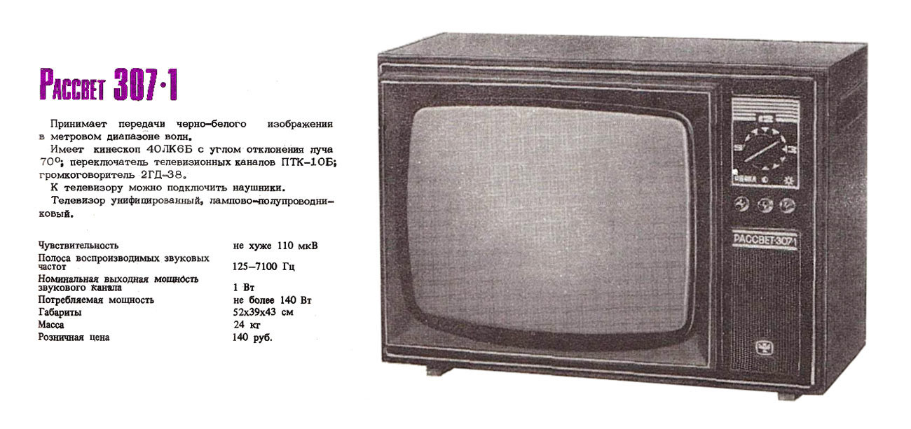 Телевизор *Рассвет-307* с 1975 года выпускал Красноярский завод телевизоров. В годовщину 20-летия основания сборочного цеха завода в производство запущена опытная партия нового унифицированного лампово-полупроводникового телевизора **Рассвет-307**. Массовый выпуск начался с 1977 года. Телевизор рассчитан на приём в любом из 12-ти каналов МВ диапазона, а при установке селектора СКД-22 и в ДМВ диапазоне. Всё детали для этого, кроме селектора в телевизоре установлены. Установлен кинескоп 40ЛК6Б. Чувствительность телевизора 110 мкВ. Разрешающая способность 500 линий. Номинальная выходная мощность 0,5 Вт. Потребляемая мощность 140 Вт. Размеры ТВ 520х420х390 мм. Масса 24 кг. Новый телевизор **Рассвет-307-1** УЛПТ-40-III-1 выпускаемый с 1982 года практически не отличается от описанного. Всего за годы выпуска телевизоров **Рассвет-307** и **Рассвет-307-1** выпущено около 8 миллионов экземпляров.