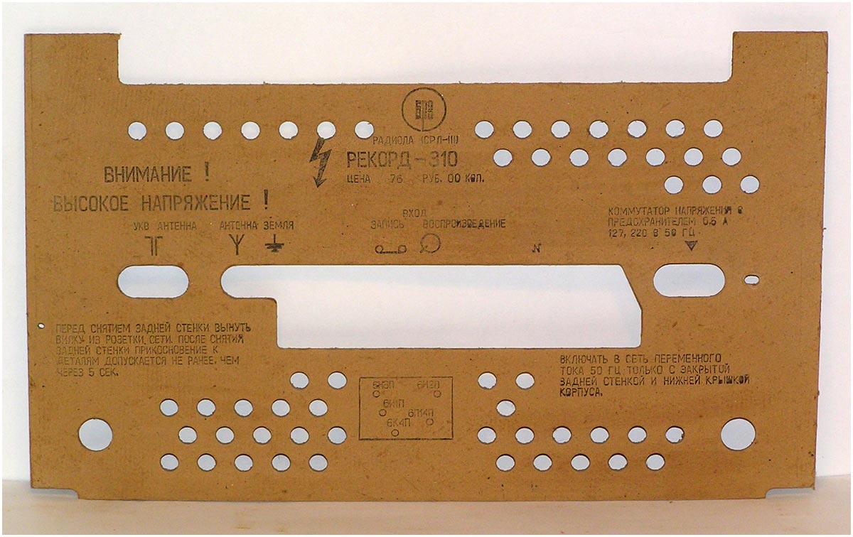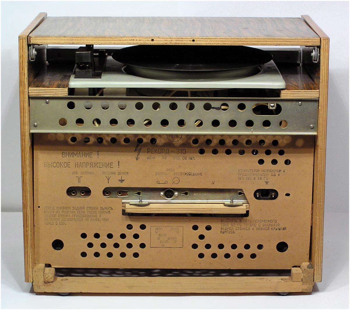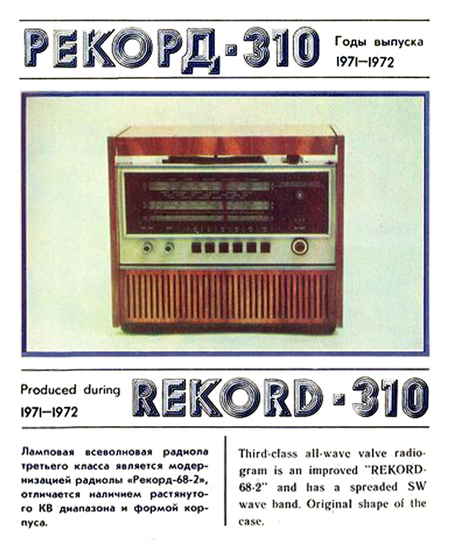 Сетевая унифицированная ламповая радиола третьего класса *Рекорд-310* с 1971 года выпускалась Бердским радиозаводом. Радиола состоит из приёмника 3-го класса и универсального трёхскоростного ЭПУ 2-го или 3-го класса, позволяющего воспроизводить записи с грампластинок любых форматов, со скоростью вращения диска: 33, 45 и 78 об/мин. Приёмник рассчитан на приём радиовещательных станций в диапазонах: ДВ, СВ, двух поддиапазонах КВ: KB1 - 75,9...40,0 м, КВ2 - 32...24,8 м и УКВ-ЧМ 4,54..4,11 м. Чувствительность в диапазонах ДВ, СВ - 200 мкВ, в 2-х поддиапазонах КВ - 300 мкВ, в диапазоне УКВ-ЧМ - 30 мкВ. Избирательность по соседнему каналу в диапазонах АМ 26 дБ. Номинальная выходная мощность усилителя низкой частоты 0,5 Вт, максимальная 1 Вт. Полоса воспроизводимых частот в тракте AM - 125...3500 Гц, тракте ЧМ и при прослушивании грамзаписи 125...7100 Гц. Питание радиолы осуществляется от сети переменного тока. Потребляемая мощность 60 Вт при приёме и 75 Вт при работе ЭПУ. Размеры радиолы 450х392х400 мм. Масса 12,5 кг.