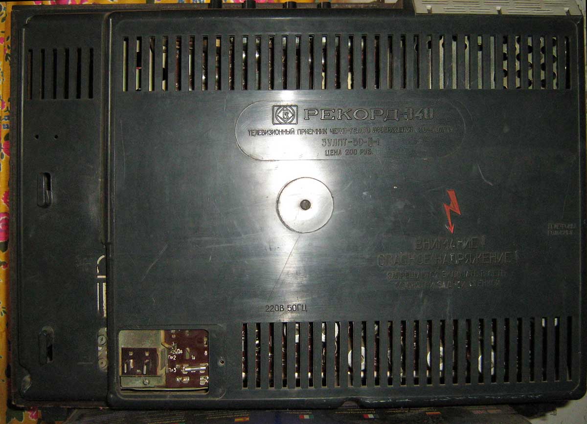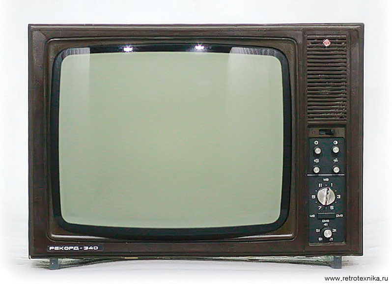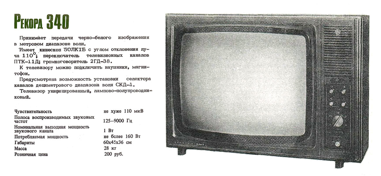 Телевизор *Рекорд-340* с 1980 года выпускал Александровский радиозавод. Очередное изменение номера на протяжении многих лет подряд в наименовании в общем то одного и того же телевизора, теперь модель **Рекорд-340**. За последние несколько лет ничего в конструкции телевизора практически не изменилось, кроме вариаций в его внешнем оформлении. Телевизор **Рекорд-340** (3УЛПТ-50-III-1) выпускался по унифицированной электрической схеме и конструкции. Размер по диагонали экрана видимой части кинескопа 50 сантиметров. Чувствительность с антенного входа 110 мкВ. Разрешающая способность 400 линий. Номинальная выходная мощность усилителя 0,5 Вт. Потребляемая мощность 155 Вт. Габариты телевизора 604х360х450 мм. Вес 28 кг. В модели устанавливали кинескоп 50ЛК1Б или 50ЛК2Б. Номера шасси были сквозные.