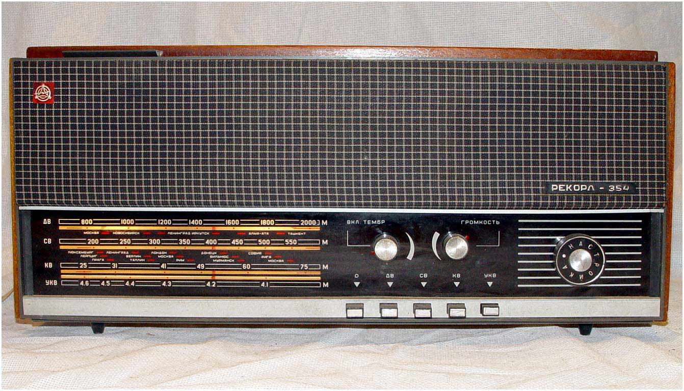 Радиола сетевая ламповая *Рекорд-354* с 1977 года выпускалась на Иркутском заводе радиоприёмников имени 50-летия СССР. Радиола 3 класса **Рекорд-354** предназначена для приёма местных и дальних радиовещательных станций в диапазонах длинных, средних, коротких и ультракоротких волн, а также для проигрывания грамзаписи с помощью электропроигрывающего устройства и записи или воспроизведения фонограмм с помощью магнитофона. Диапазоны принимаемых волн (или частот): Длинные волны (ДВ) - 2000...735,3 м (150...408 кГц). Средние волны (СВ) - 571,4...186,9 м (525...1605 кГц). Короткие волны (КВ) - 75,9...24,8 м (3,95...12,1МГц). Ультракороткие волны (УКВ) - 4,56...4,11 м (65,8...73,0МГц). Чувствительность не хуже: в диапазонах ДВ и СВ - 200 мкВ, в диапазоне КВ - 300 мкВ, в диапазоне УКВ-ЧМ - 30 мкВ. Избирательность (при расстройке на +/- 10 кГц) в диапазонах ДВ и СВ, не менее 26 дБ. Номинальная выходная мощность 0,5 Вт. При приёме радиостанций радиола воспроизводит полосу звуковых частот в диапазонах ДВ, СВ и КВ - 150...3500 Гц, в диапазоне УКВ - 150...7000 Гц. При проигрывании грампластинок или подключении магнитофона 150...7000 Гц. Питание радиолы осуществляется от сети переменного тока, напряжением 127 или 220 В, частотой 50 Гц. Мощность, потребляемая от сети 220 В не более 65 Вт. Габаритные размеры радиолы - 554х292х249 мм. Масса без упаковки - 13 кг, с упаковкой не более 17 кг. Розничная цена радиолы - 74 рубля 00 копеек. Радиола **Рекорд-354** стала последней моделью в линейке ламповых радиоприёмников и радиол из серии **Рекорд**.