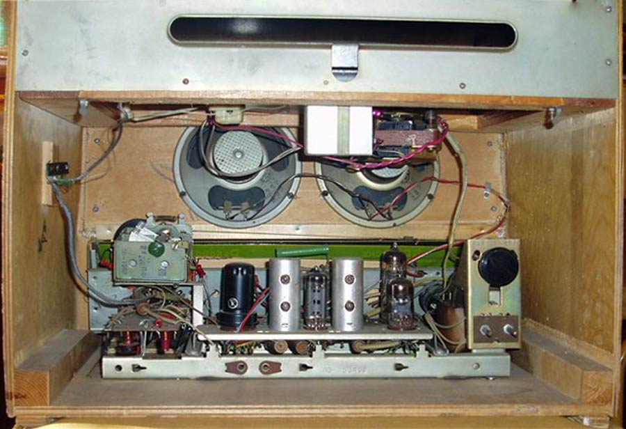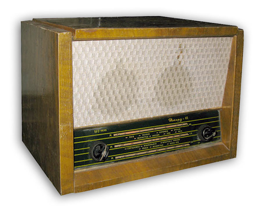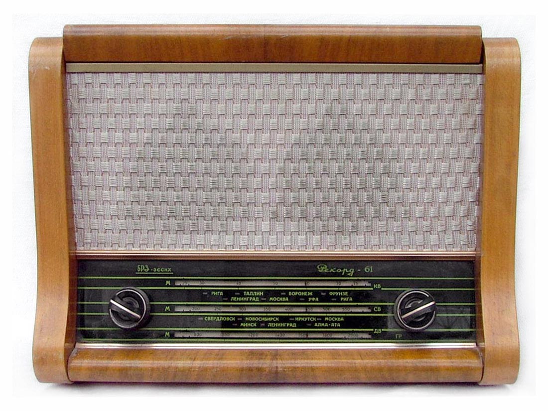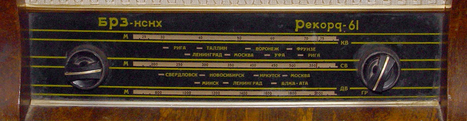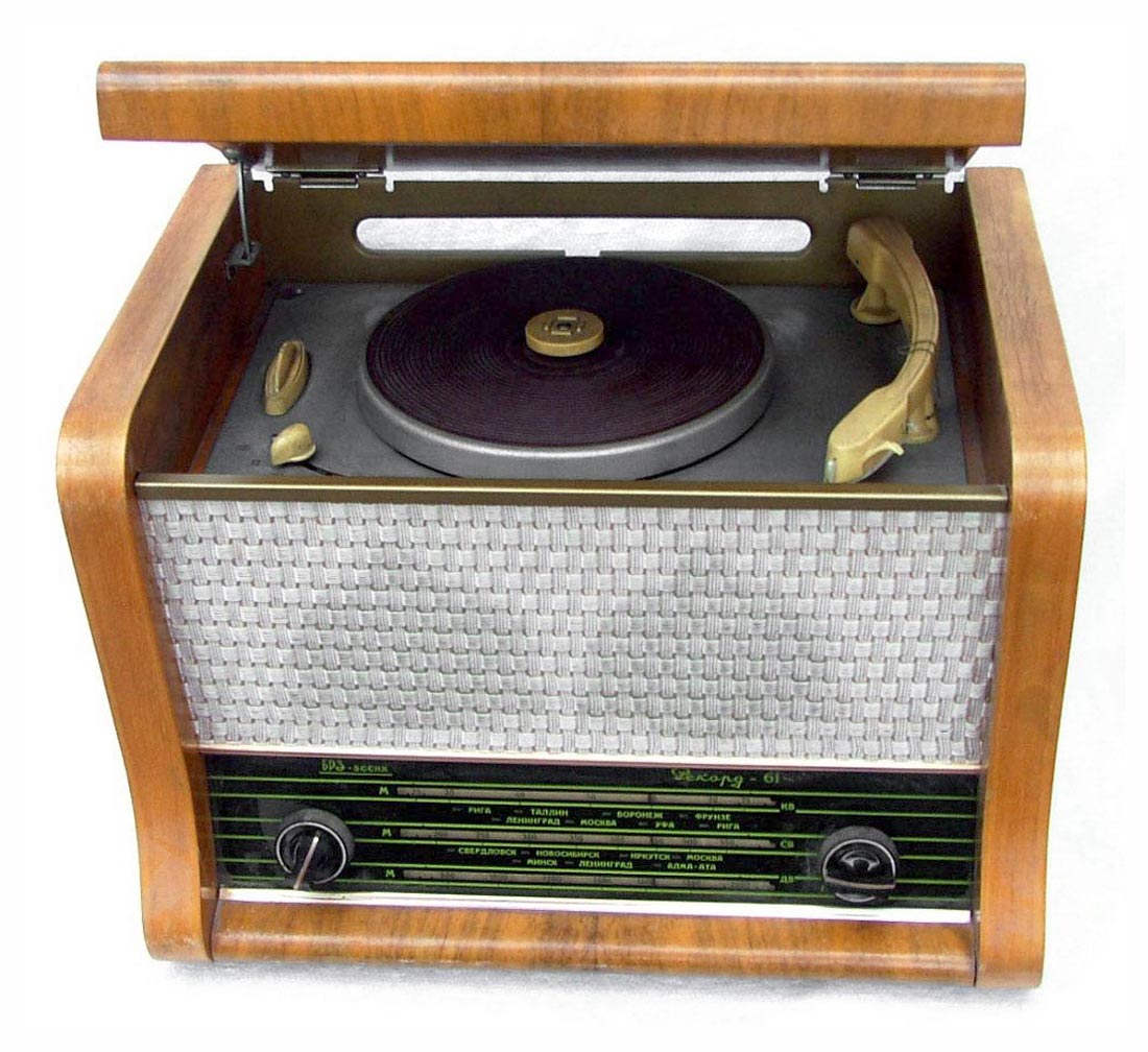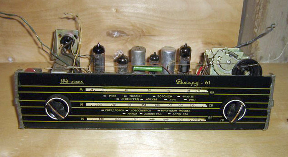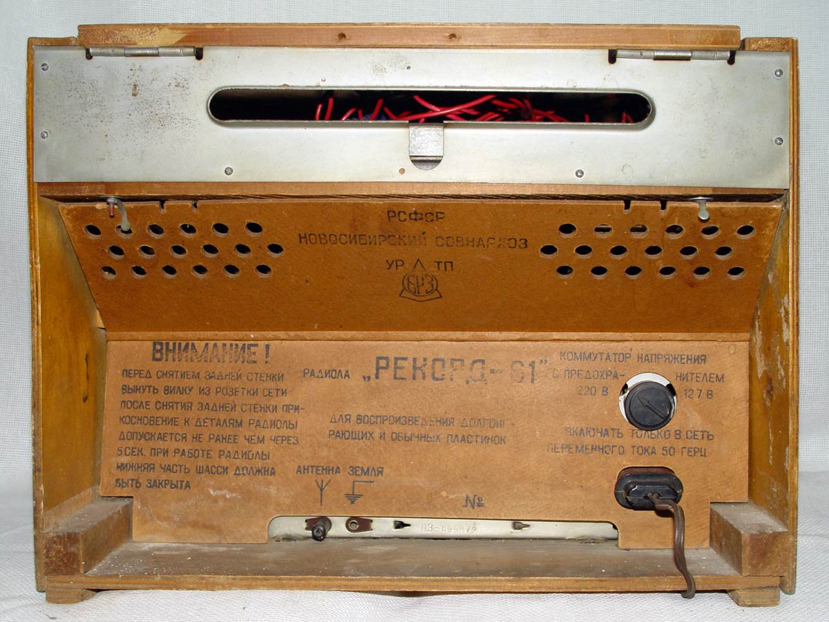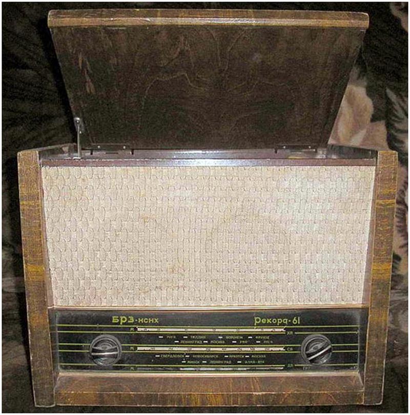 Сетевая ламповая радиола *Рекорд-61* с 1961 года выпускалась Бердским радиозаводом. Радиола предназначена для приёма в диапазонах ДВ, СВ и КВ (76...24,8 м) волн. Трехскоростной, на 33, 45 и 78 об/мин электропроигрыватель радиолы позволяет проигрывать обычные и долгоиграющие грампластинки. Промежуточная частота 465 кГц. Избирательность по соседнему каналу 30 дБ. Чувствительность на всех диапазонах 200 мкВ. Выходная мощность на двух громкоговорителях типа 1ГД-5 - 0,5 Вт. Диапазон воспроизводимых частот при приёме 100...4000 Гц, при проигрывании грампластинок 100...6000 Гц. Мощность потребляемая от сети при проигрывании пластинок 55 Вт, при работе на приём 40 Вт. Монтаж радиолы выполнен навесным способом. В первых выпусках в преобразователе стояла радиолампа 6А7. В 1962 году радиола была модернизирована, получив новый, более современный футляр. Электрическая схема радиолы осталась прежняя, но монтаж, кроме контуров был выполнен печатным способом. В документации и схемах радиолы (не везде) появилась буква *М*. Радиола выпускалась и в старом футляре, причём в более массовом количестве. В 1962 году была предпринята попытка выпустить радиолу *Рекорд-61* с клавишным переключателем диапазонов и в новом оформлении, но кроме изготовления опытных радиол дальше не пошло. Радиолу *Рекорд-61* в 2-х видах оформления футляра выпускали до августа 1965 года.